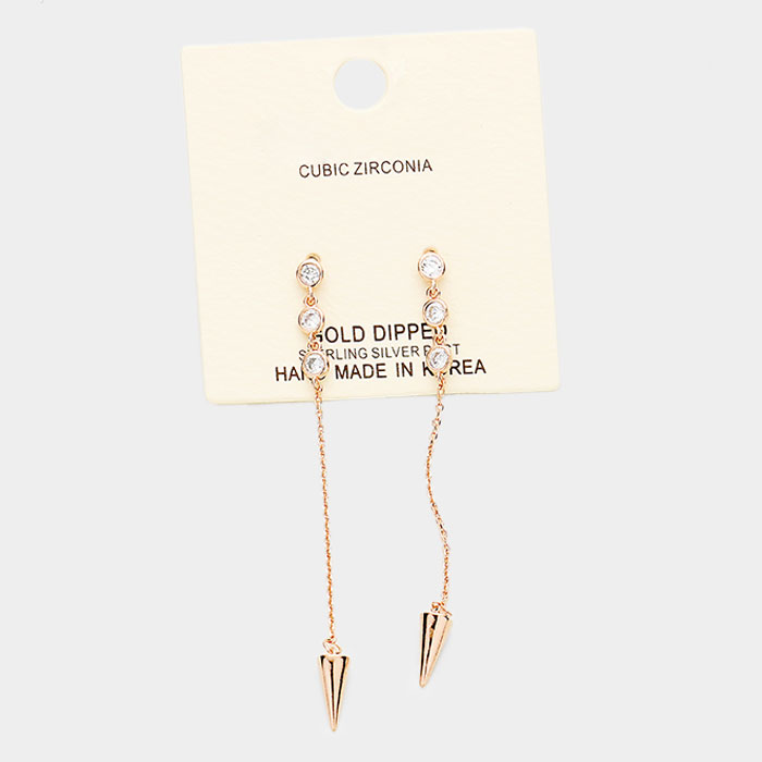 Gold Dipped Triple Cubic Zirconia Metal Spike Drop Earrings