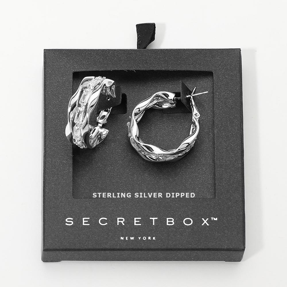 SECRET BOX_Sterling Silver Dipped Baguette Stone Embellished Twisted Hoop Earrings SECRET BOX_Sterling Silver Dipped Baguette Stone Embellished Twisted Hoop Earrings