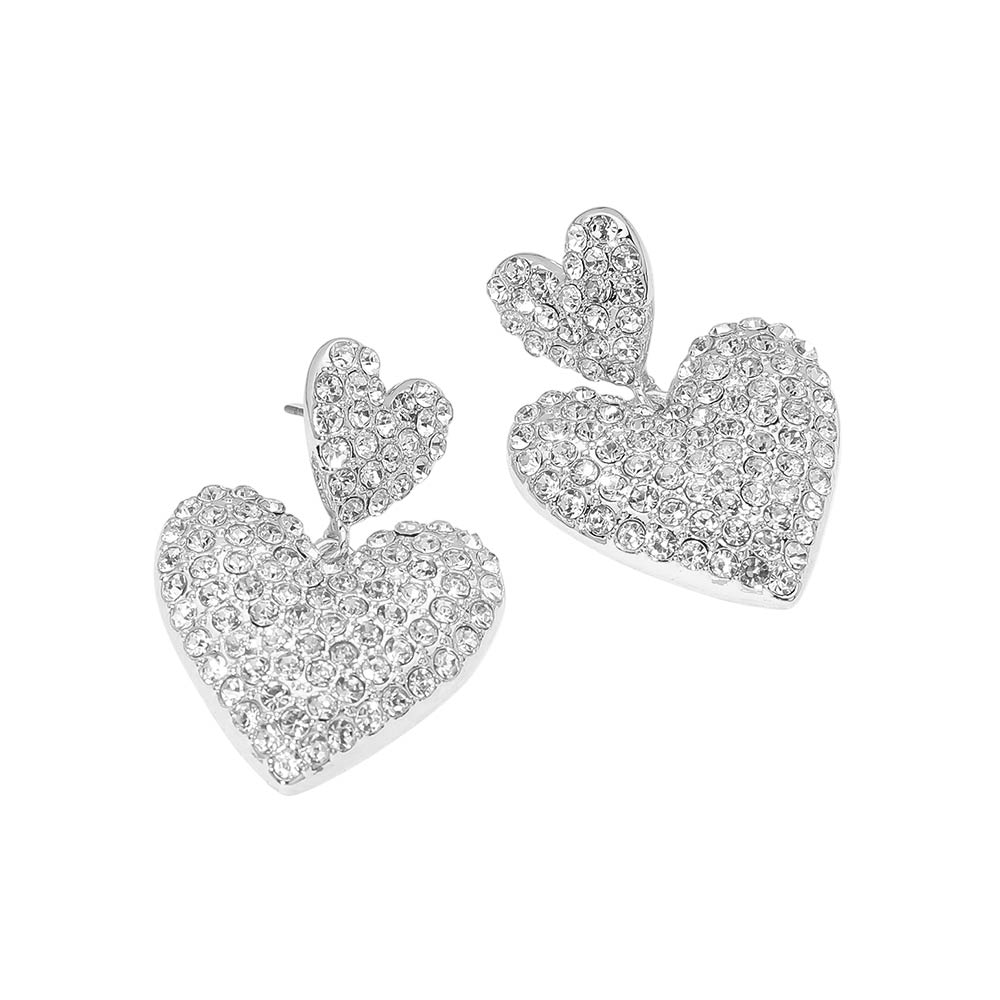 Details • Size : 1.25" X 1.75" • Post Back • These double heart drop stud earrings feature layered heart shapes detailed with sparkling crystal accents for an elegant statement look. Designed to add shine and dimension, they are perfect for everyday styling, romantic outfits, gifting moments, and boutique collections seeking eye-catching yet wearable heart-inspired jewelry. • Sterling Silver Dipped • Lead and Nickel Compliant