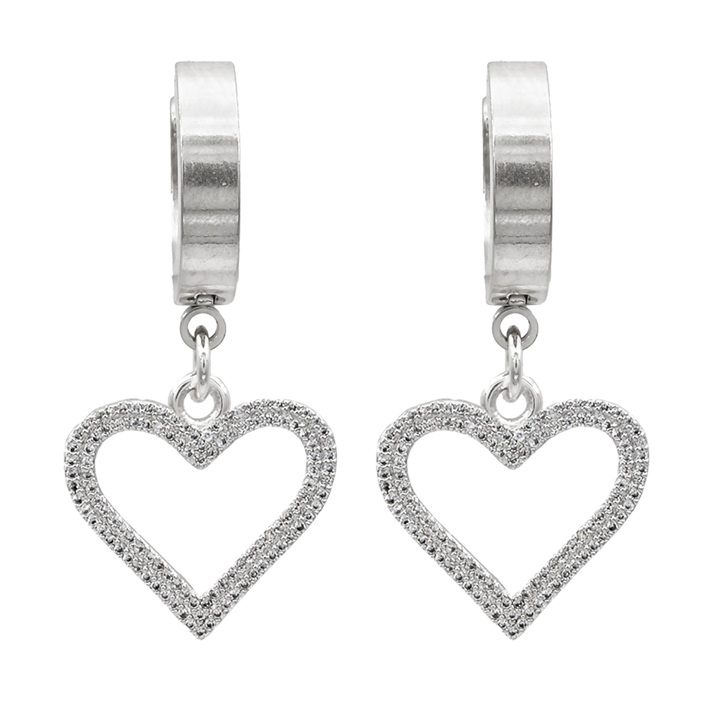Stainless Steel CZ Stone Paved Open Heart Charm Dangle Huggie Earrings