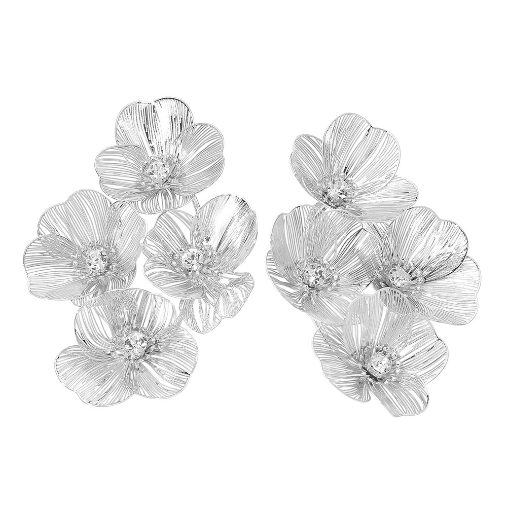 Details • Size : 2.25" X 3.2" • Post Back • Statement earrings featuring layered openwork petals in a blooming floral design. Each flower is accented with a sparkling crystal center, creating a sculptural look that blends elegance and artistry—perfect for elevating both evening and special occasion styles. • Lead and Nickel Compliant