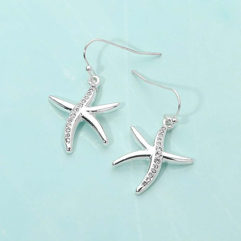 Details • Size : 0.75" X 1.25" • Fish Hook Back • Ocean inspired starfish dangle earrings designed with a graceful hook silhouette that adds movement and charm. A playful yet polished accessory ideal for beach themed styling, summer outfits, vacation looks, and boutique gift assortments seeking nature inspired statement jewelry. • Lead and Nickel Compliant