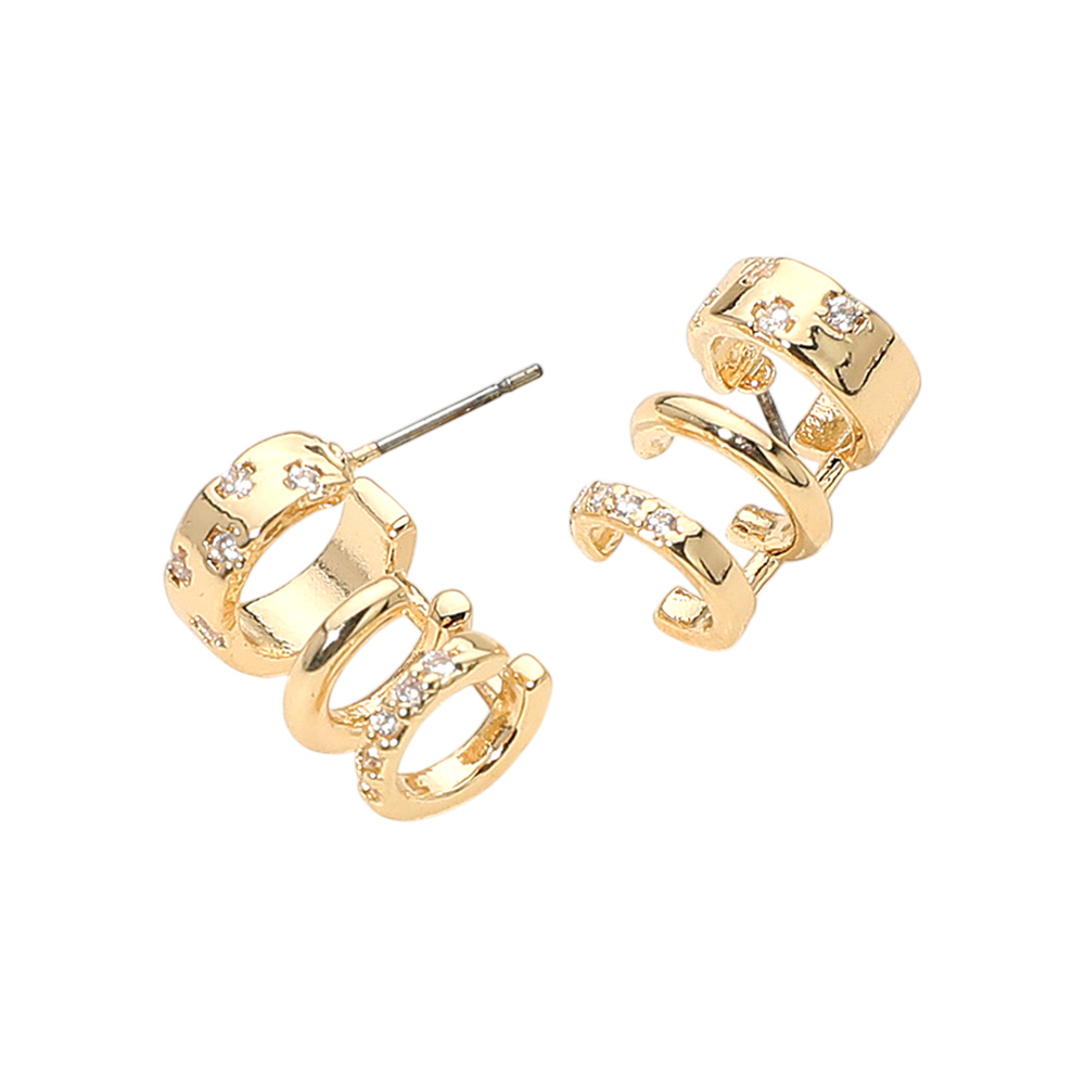 Details • Size : 0.4" X 0.6" • Post Back • Trendy ear cuff earrings featuring a stacked triple hoop design accented with sparkling crystals. A versatile and modern accessory that adds bold elegance to casual looks, parties, and evening outfits. • Brass • Lead and Nickel Compliant