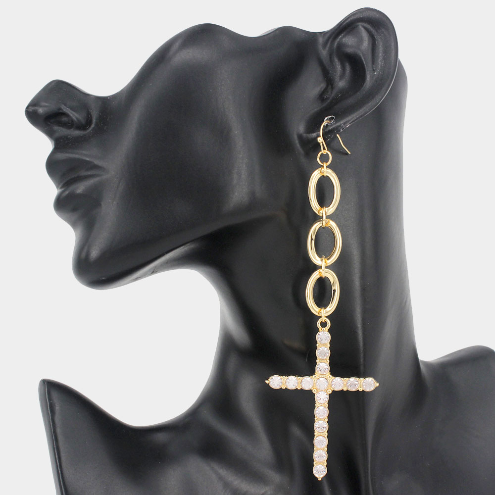 Triple Open Oval Stone Embellished Cross Link Dangle Earrings