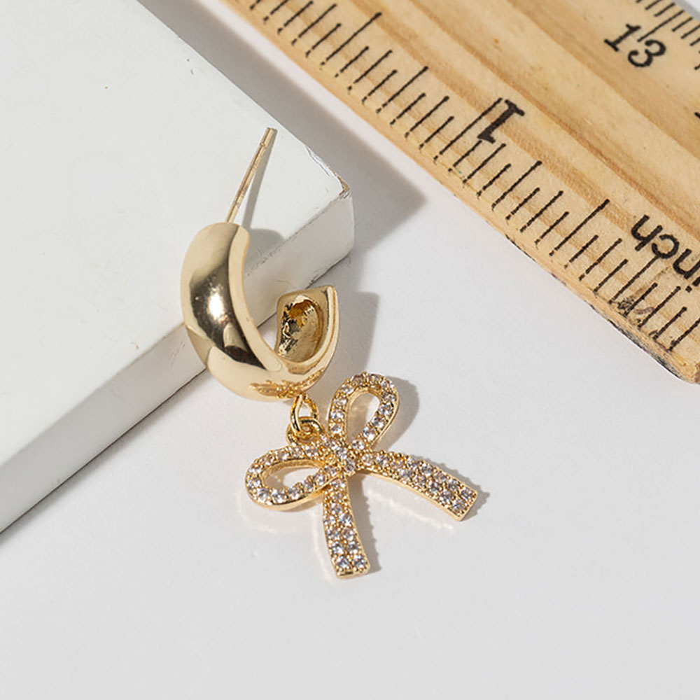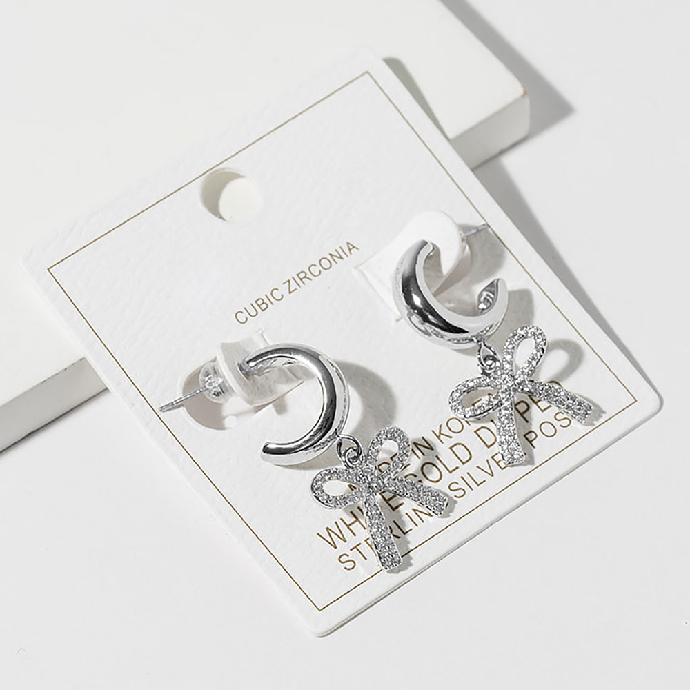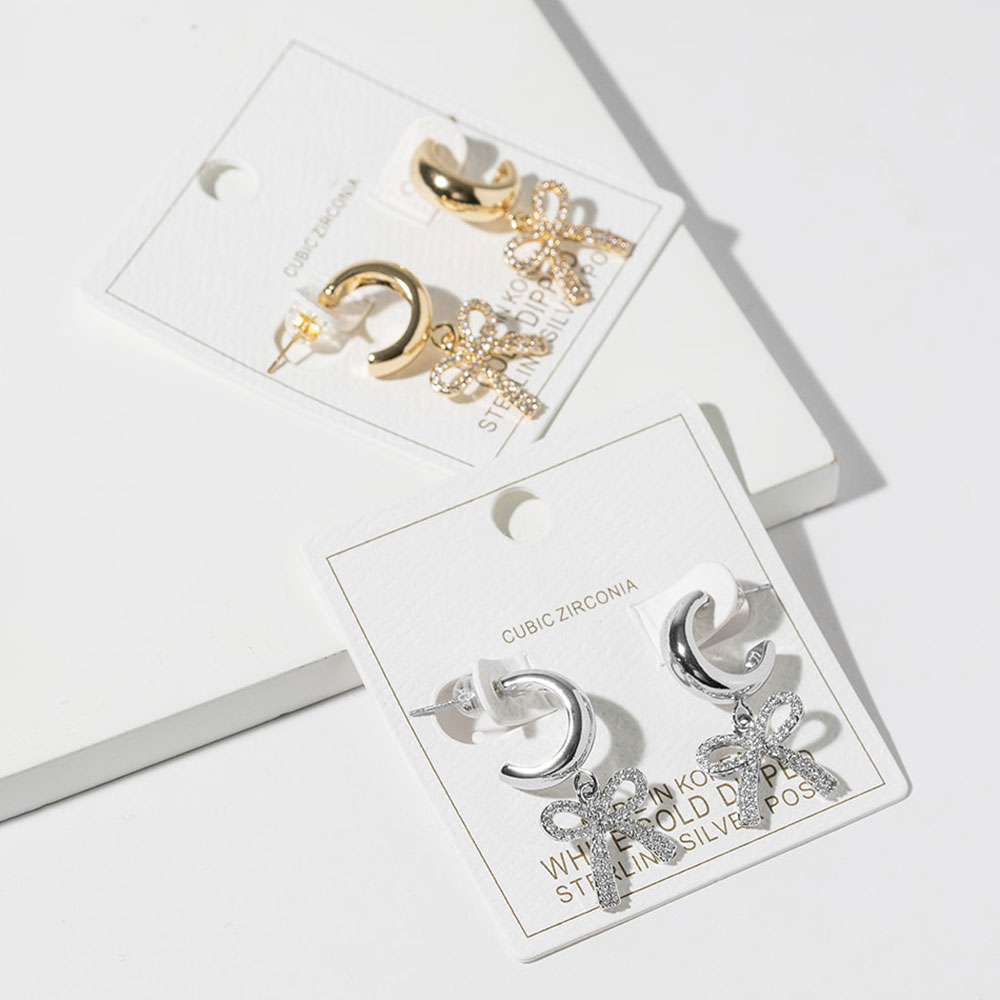 Details • Size : 0.6" X 1.25" • Stylish crescent hoop earrings finished with a sparkling CZ bow charm that adds graceful movement and feminine appeal. This elegant drop design blends playful detail with a polished silhouette, making it ideal for everyday styling, gifting, and boutique jewelry collections seeking timeless yet trendy accents. • CZ Cubic Zirconia • Gold Dipped • Lead and Nickel Compliant • Made In Korea • Sterling Silver Post