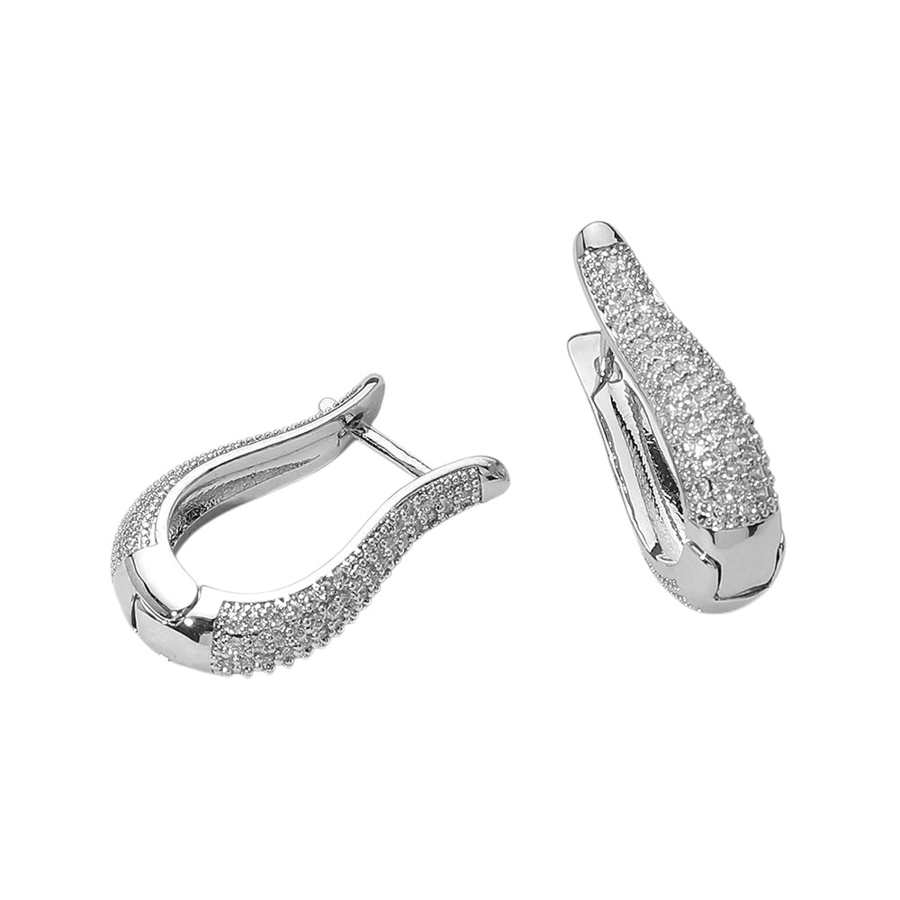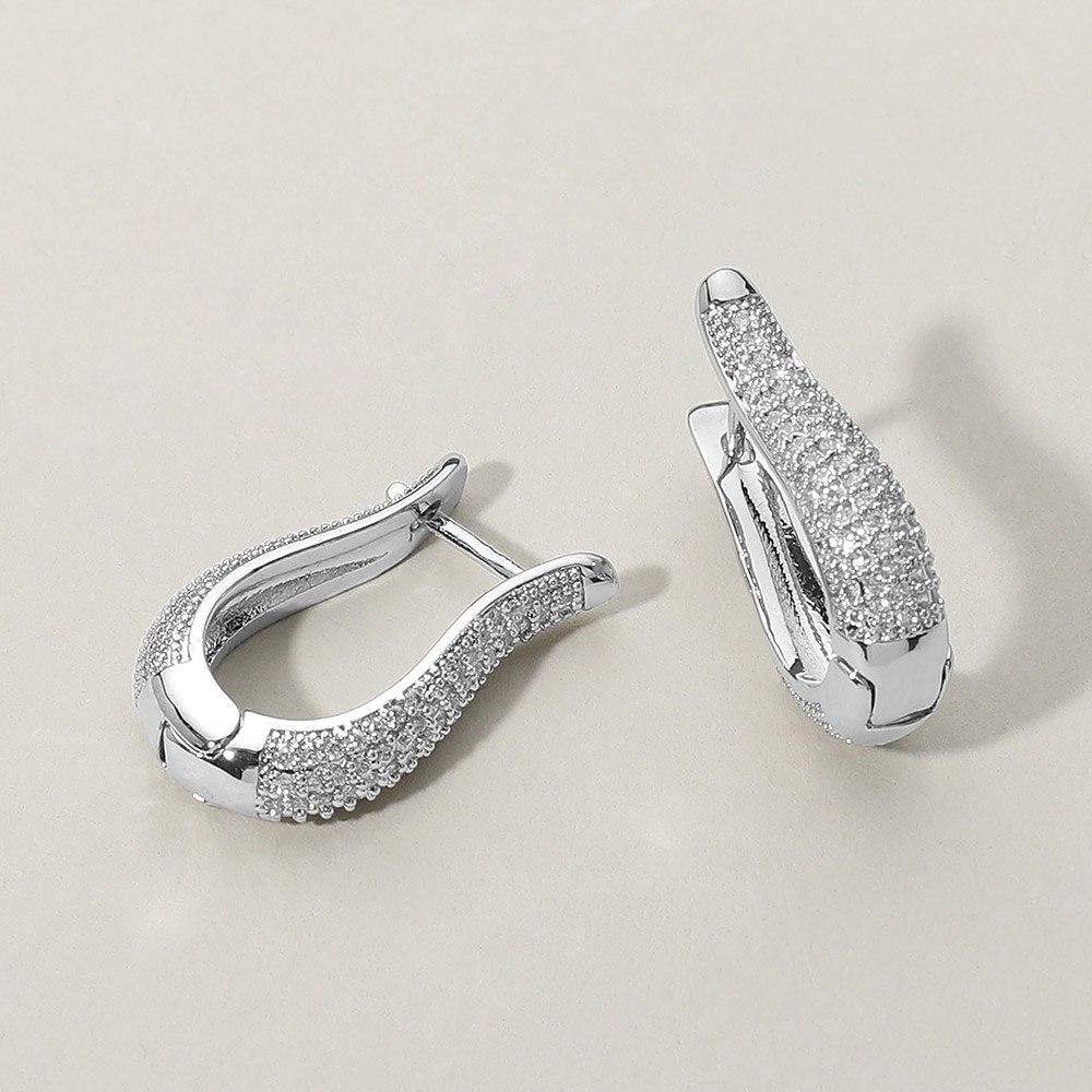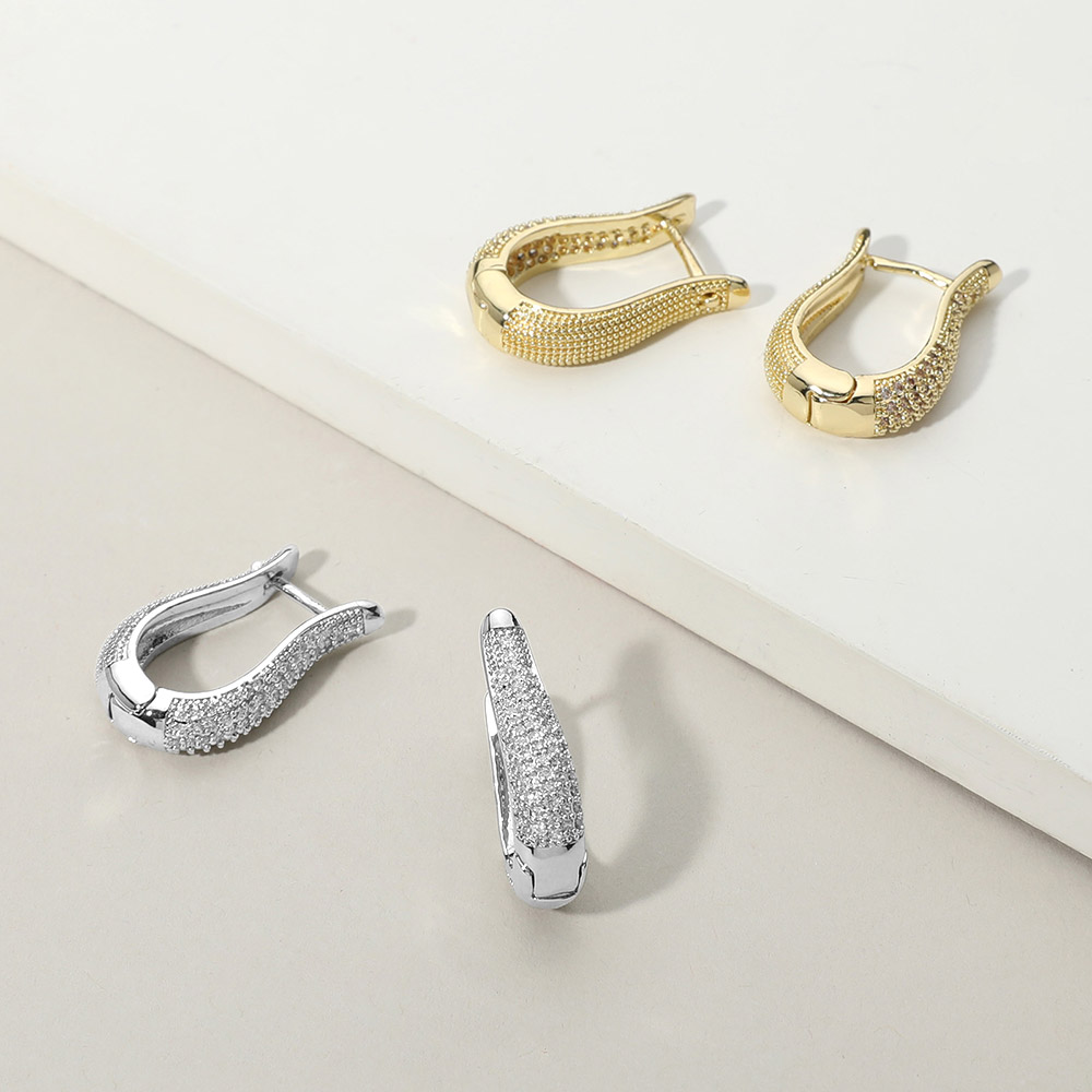Details • Size : 0.6" X 1" X 0.25" • Huggie Back • Elevate your style with these curved hoop earrings featuring a sleek, textured surface and shimmering details. Their sculptural silhouette blends elegance with modern charm, making them a versatile accessory for both daytime sophistication and evening glamour. • Lead and Nickel Compliant • Gold Dipped • CZ Cubic Zirconia