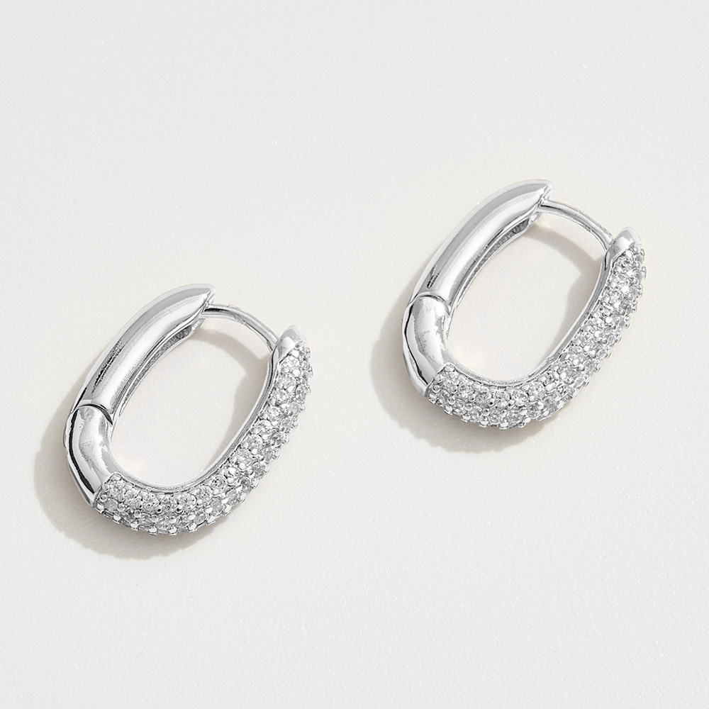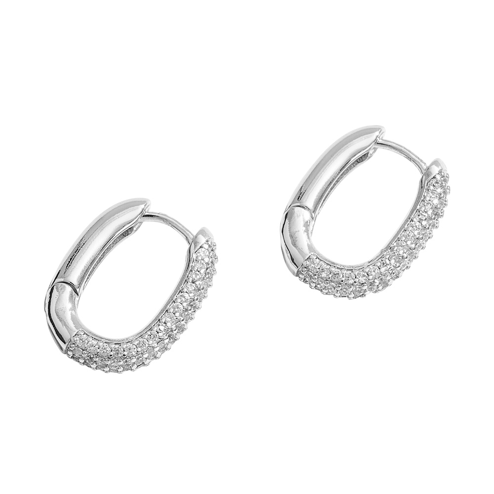 White Gold Dipped CZ Stone Paved Oval Huggie Hoop Earrings White Gold Dipped CZ Stone Paved Oval Huggie Hoop Earrings White Gold Dipped CZ Stone Paved Oval Huggie Hoop Earrings