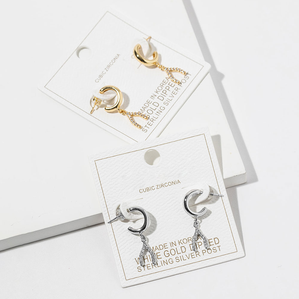 Details • Size : 0.5" X 1" • Modern crescent hoop drop earrings featuring a sleek curved hoop paired with a sparkling CZ-style wishbone accent. Designed for everyday wear or elevated styling, these earrings offer subtle shine, graceful movement, and a versatile silhouette ideal for boutiques and curated accessory collections. • CZ Cubic Zirconia • Gold Dipped • Lead and Nickel Compliant • Made In Korea • Sterling Silver Post