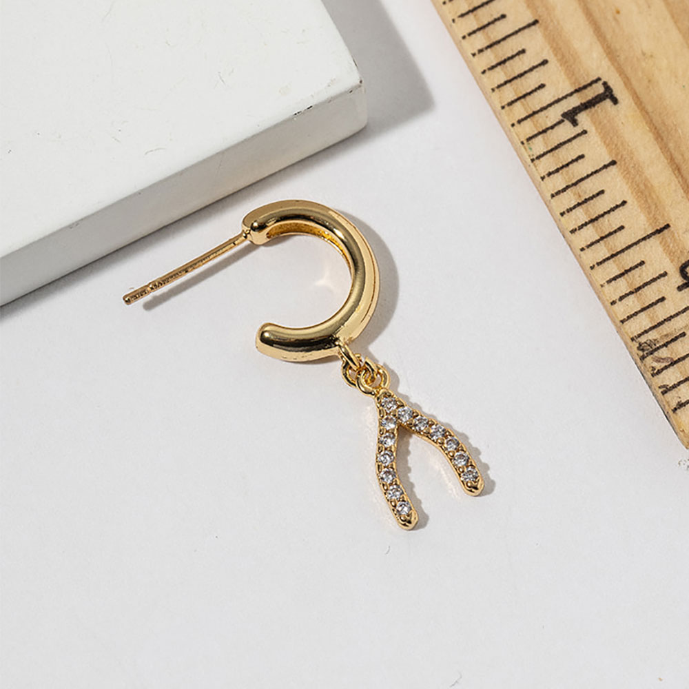 Gold Dipped CZ Stone Paved Wishbone Drop Dangle Mini Hoop Earrings