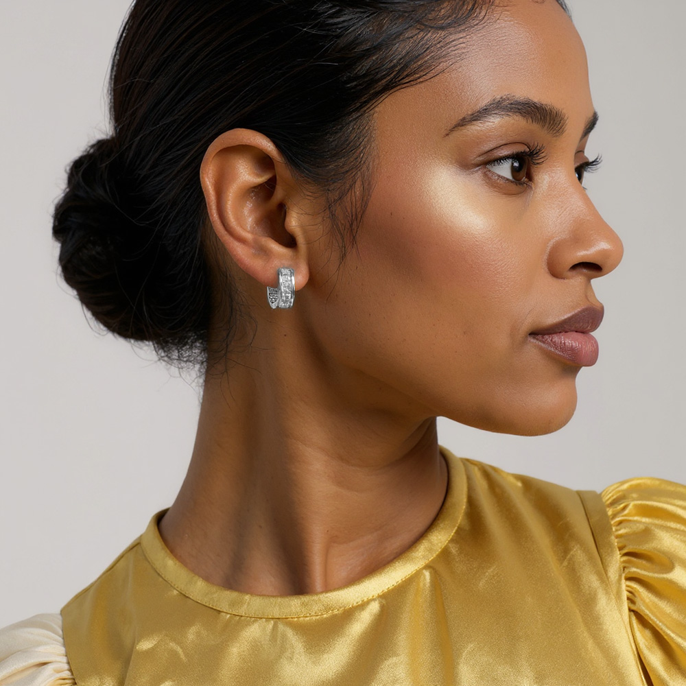 • These hoop earrings feature square cut cubic zirconia set in a sleek channel design for a refined and radiant look. With their modern silhouette and sparkling brilliance, they make a versatile accessory that complements everyday wear or adds polish to evening ensembles.