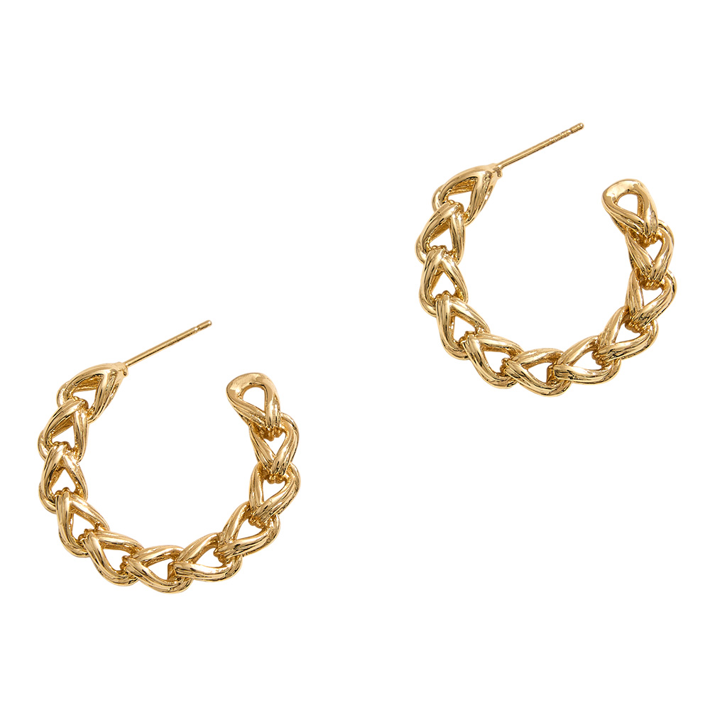 Details • Size : 1.2" X 1.2" • Post Back • Make a chic statement with these chain-link hoop earrings. Designed with interlocking links that form a bold open hoop, they bring a modern twist to classic styling. Perfect for everyday wear or evening outfits, they add texture, dimension, and effortless sophistication. • Brass • Gold Dipped • Hypoallergenic • Lead and Nickel Compliant • Made In Korea