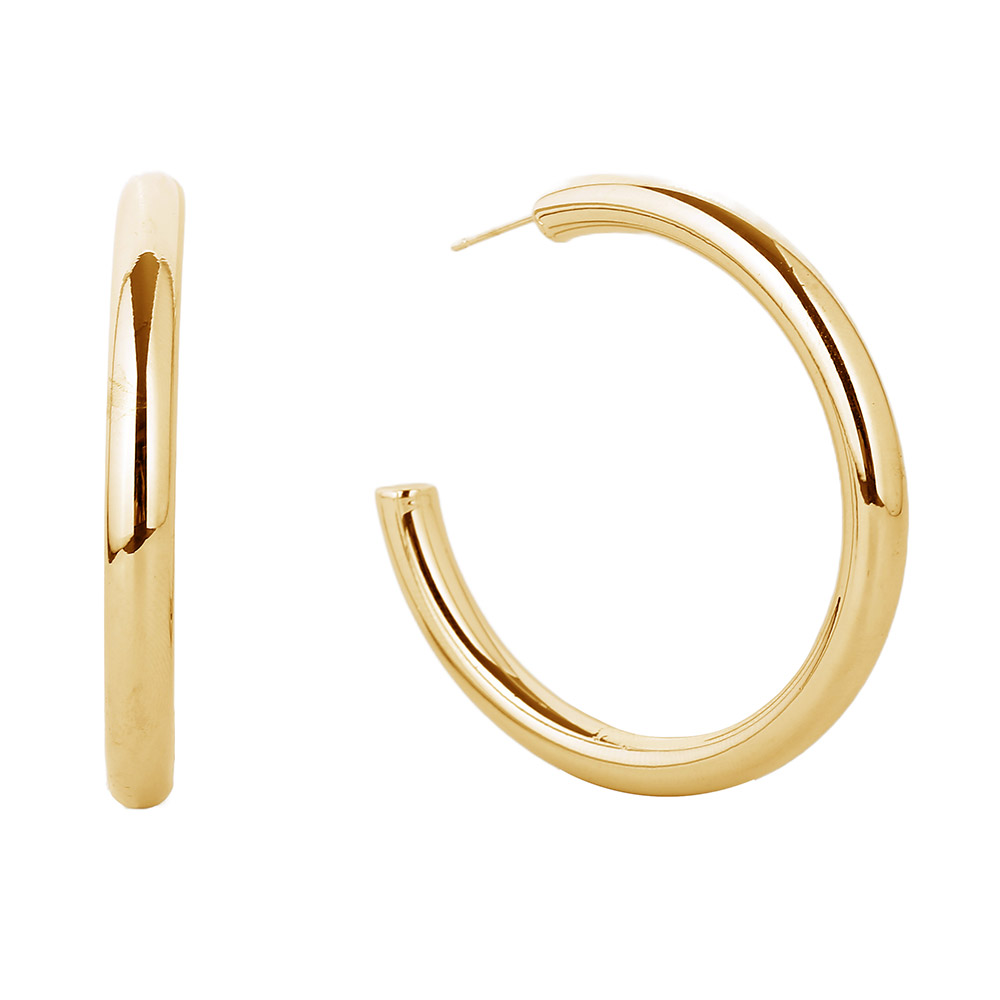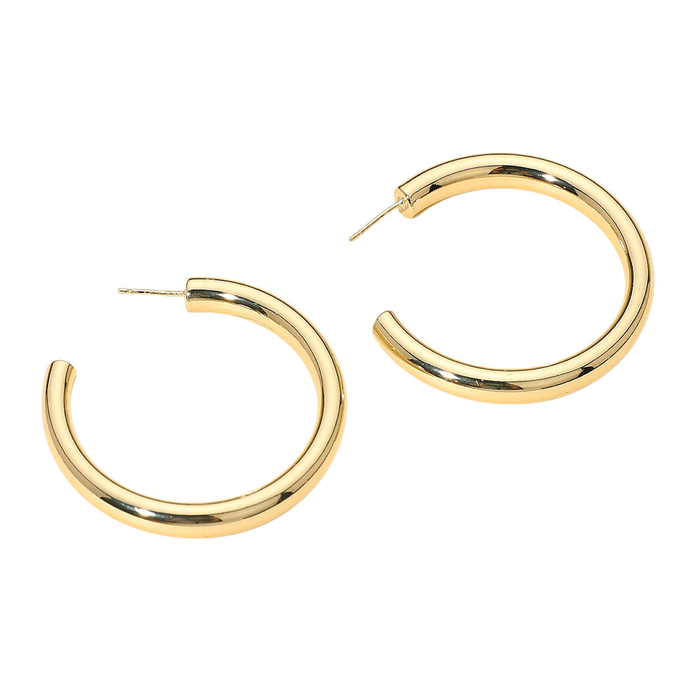 Details • Size : 2" X 2" • Post Back • Make a statement with these sculpted open hoop earrings, designed in a bold chunky silhouette. Their contemporary open-ended style adds effortless edge, perfect for elevating casual looks or complementing evening wear with modern sophistication. • Brass • Gold Dipped • Hypoallergenic • Lead and Nickel Compliant • Made In Korea