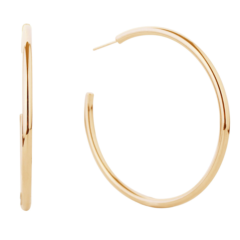 Details • Size : 2.4" X 2.4" • Post Back • Water resistant plating • Sleek medium hoop earrings with a polished, lightweight design for all-day comfort. A timeless and versatile accessory, perfect for both casual and dressy outfits, adding a subtle yet elegant touch to any style. • Brass • Gold Dipped • Hypoallergenic • Lead and Nickel Compliant • Made In Korea