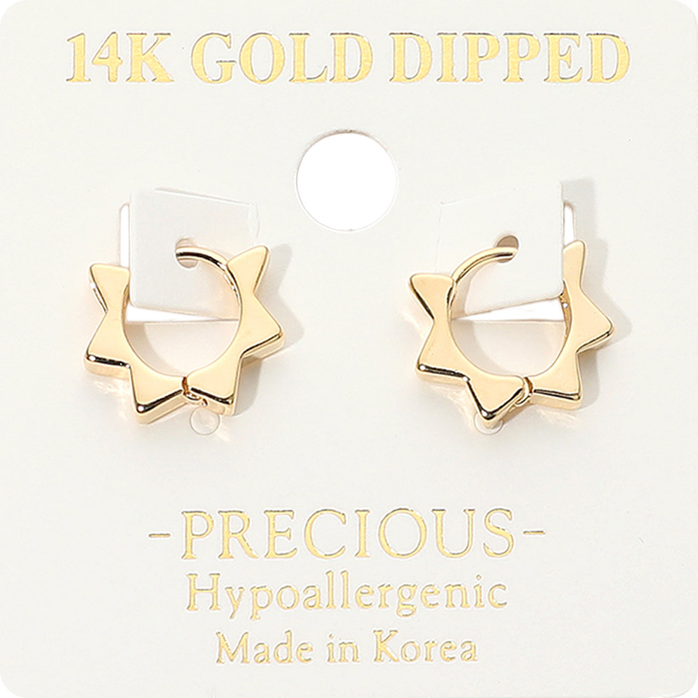 Details • Size : 0.6" X 0.6" • Huggie Back • Add playful charm to your everyday style with these spike hoop earrings featuring a sleek open-star silhouette for a modern twist on a classic shape. Lightweight and comfortable for all-day wear, they pair effortlessly with casual outfits or layered looks and make a fun, thoughtful accessory gift. • Gold Dipped • Hypoallergenic • Made In Korea