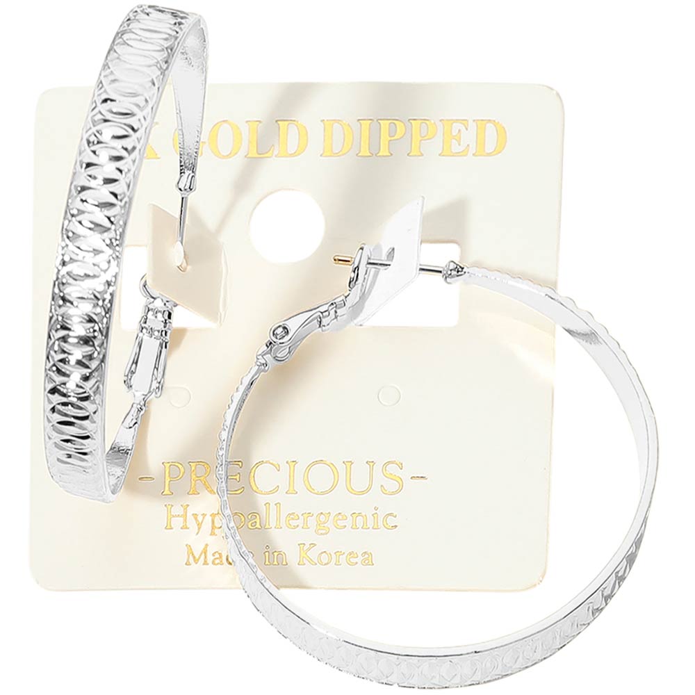 Details • Size : 1.6" X 1.6" X 0.25" • Omega Back • Add modern flair to your accessories with these shimmering textured hoop earrings. The reflective finish and subtle wave pattern bring a sleek sophistication, perfect for elevating your everyday look or complementing a night-out ensemble with ease. • Hypoallergenic • Made In Korea • Gold Dipped
