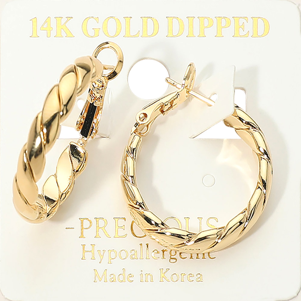 Details • Size : 1" X 1" • Omega Back • These twisted hoop earrings showcase a bold rope-inspired design that adds texture and dimension to any look. Finished with a secure latch closure, they offer comfortable all-day wear and a dependable fit. A timeless accessory ideal for everyday styling or elevated outfits. • Gold Dipped • Hypoallergenic • Made In Korea