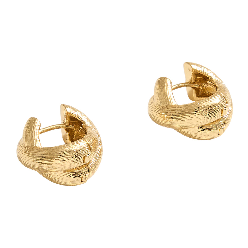 • Elegant huggie hoop earrings featuring a knotted design with a textured finish that adds depth and sophistication. Their versatile style makes them perfect for both casual and dressy looks, offering timeless charm and everyday wearability.