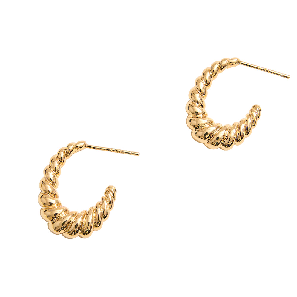 Details • Size : 0.7" X 0.75" • Post Back • Elevate your style with these twisted ribbed hoop earrings, featuring a bold sculptural design that adds depth and texture. Their sleek, polished finish makes them the perfect blend of modern elegance and timeless charm, ideal for day-to-night wear. • Brass • Gold Dipped • Hypoallergenic • Lead and Nickel Compliant • Made In Korea
