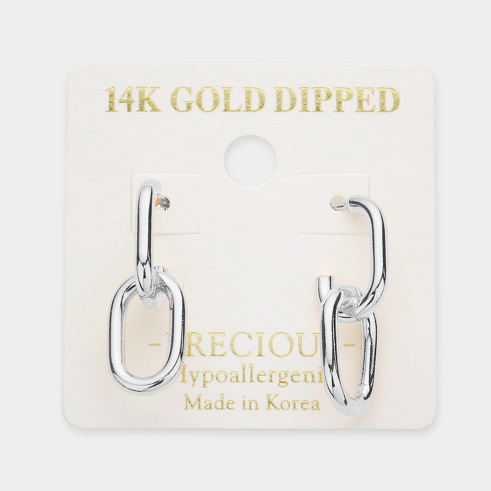 14K White Gold Dipped Double Open Metal Oval Link Dangle Earrings
