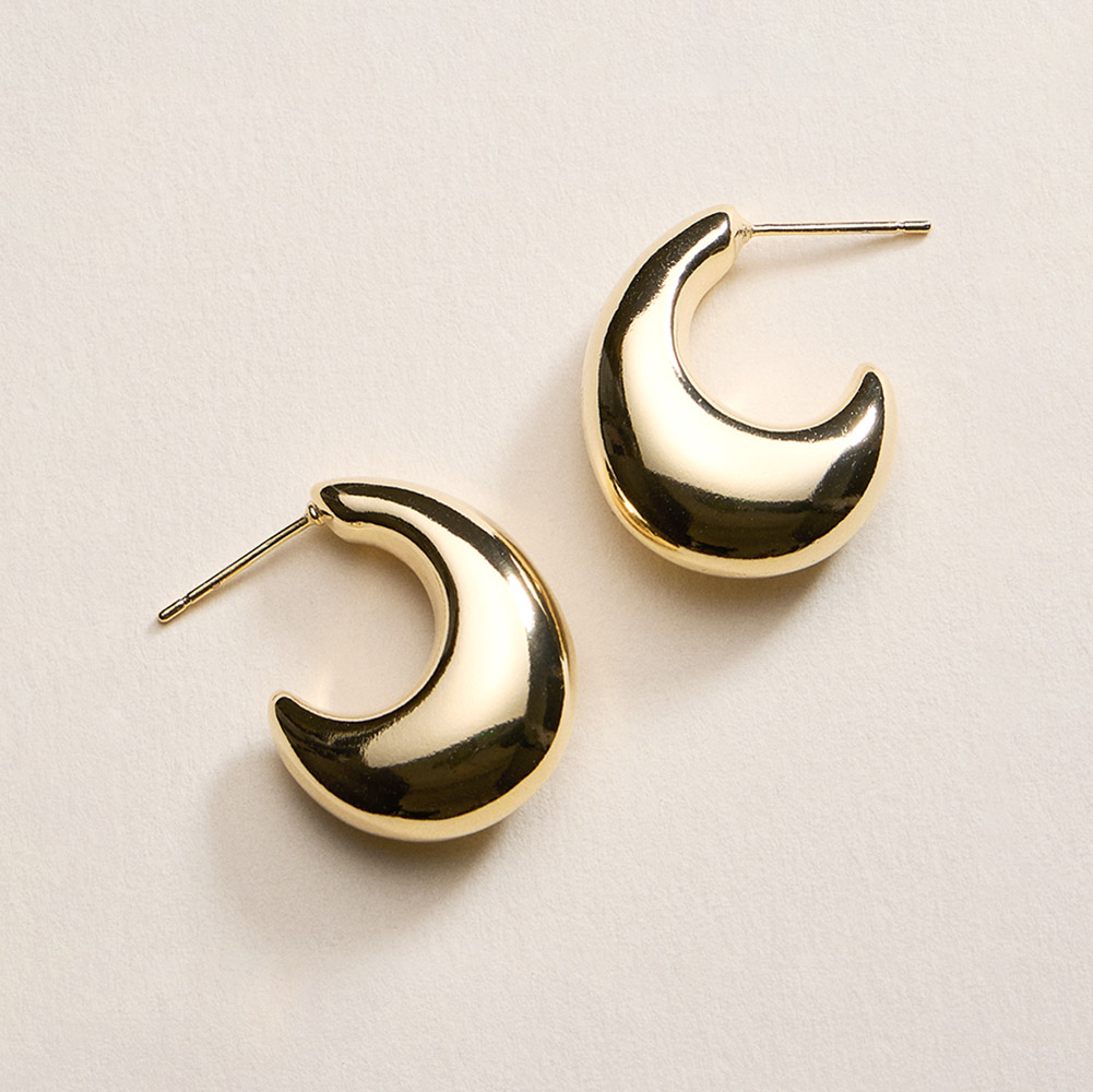 Details • Size : 0.75" X 1" X 0.3" • Post Back • Bold crescent-shaped hoop stud earrings designed to add modern volume and polished appeal. The smooth curved silhouette creates a statement look while remaining comfortable for daily wear, work outfits, and evening styling. A versatile accessory ideal for trend-focused collections and gifting. • Gold Filled • Hypoallergenic • Lead and Nickel Compliant • Made In Brazil