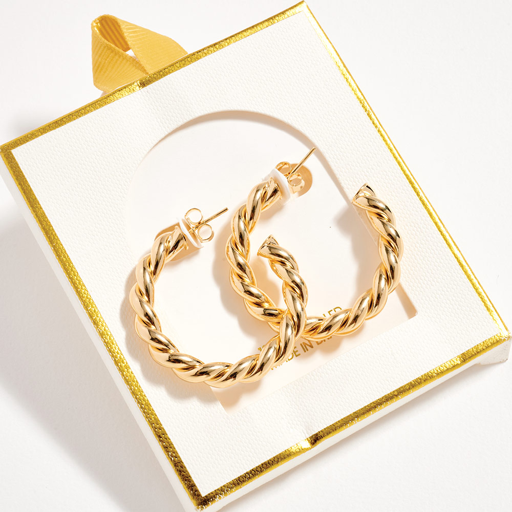 Details • Size : 1.5" X 1.5" X 0.25" • Post Back • Bold twisted hoop earrings featuring a rope-inspired design that adds texture and movement to any outfit. A timeless silhouette with a modern edge, perfect for everyday wear or elevated styling, ideal for gifting, layering, or making a confident statement with effortless versatility. • Lead and Nickel Compliant • Hypoallergenic • Gold Filled • Made In Brazil