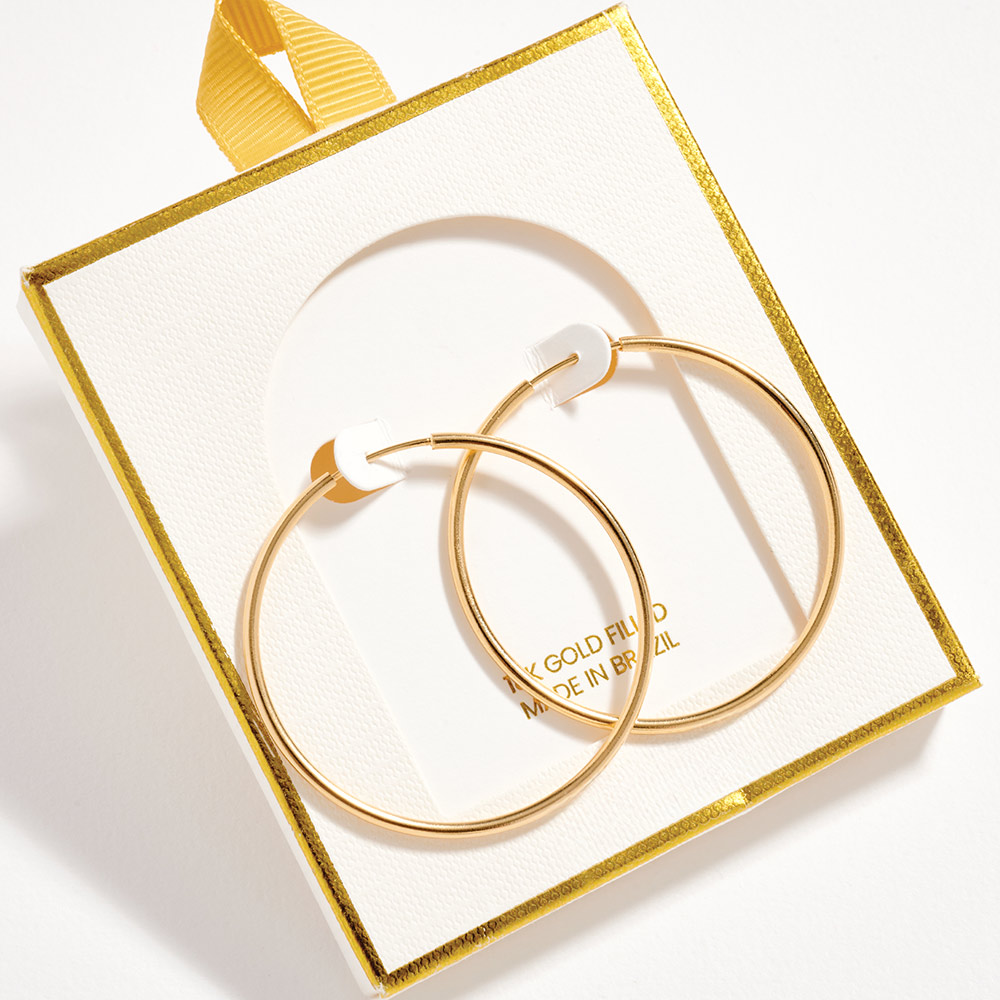 Details • Size : 1.75" X 1.75" • Spring Back • Timeless thin hoop earrings designed with a clean, minimal silhouette for effortless styling. Lightweight and easy to wear, these hoops pair perfectly with casual outfits or polished looks, making them a versatile staple for daily wear, layering, or gifting. • Gold Filled • Hypoallergenic • Lead and Nickel Compliant • Made In Brazil