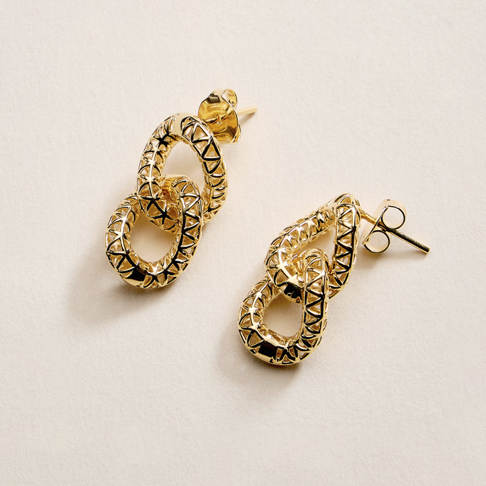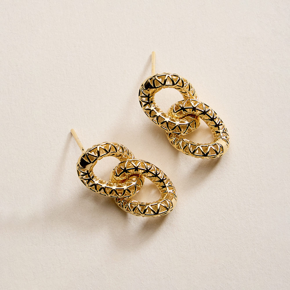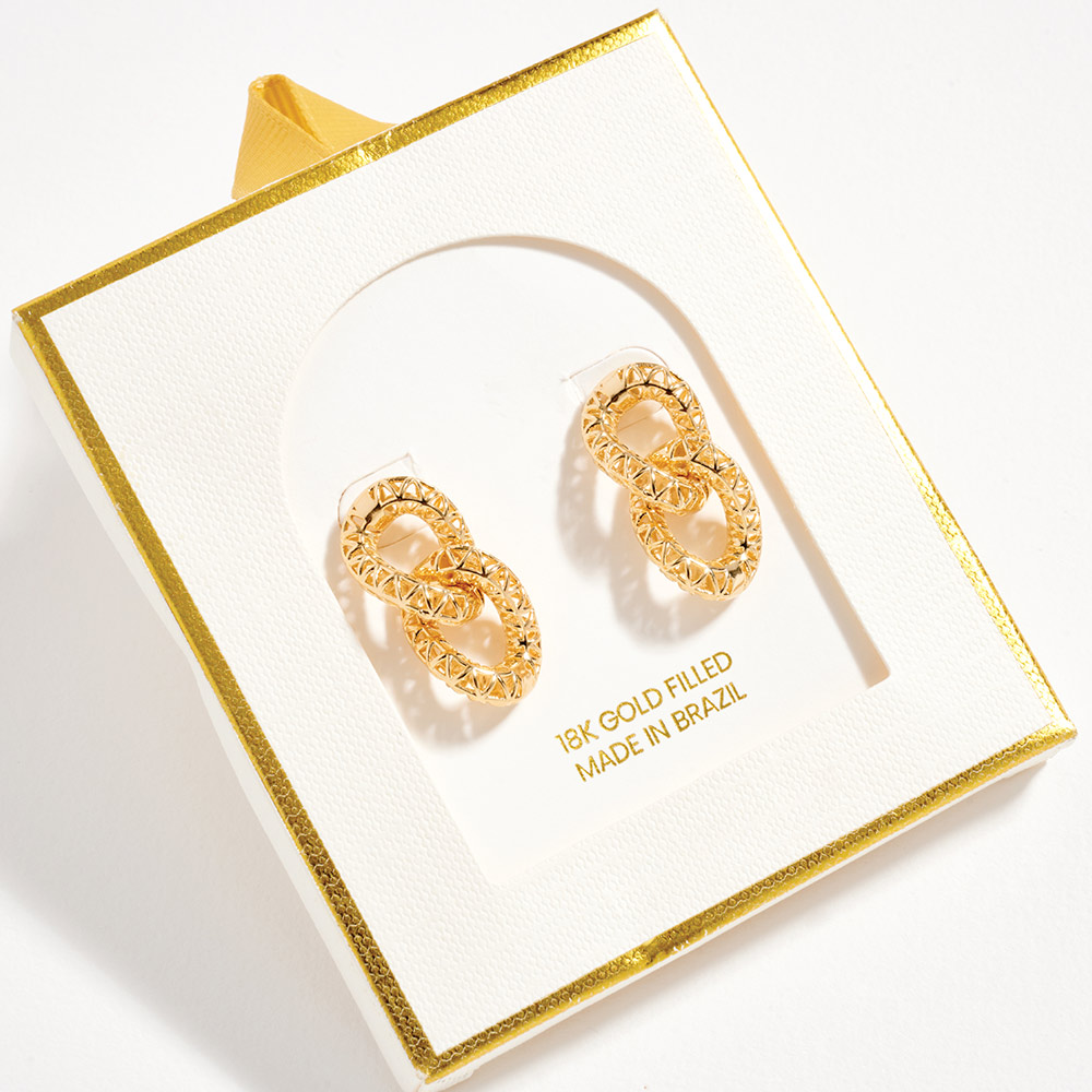 Details • Size : 0.6" X 1" • Post Back • Textured double link hoop earrings designed with an interlocking silhouette for a bold yet refined statement. The sculpted surface adds visual depth while maintaining a clean, modern look. Lightweight and easy to style, these earrings transition effortlessly from everyday outfits to elevated occasions, making them a versatile addition to curated jewelry collections and gift-ready assortments. • Gold Filled • Hypoallergenic • Lead and Nickel Compliant • Made In Brazil