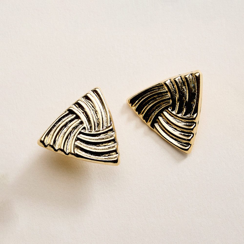 Details • Size : 1.1" X 1" • Post Back • Modern triangle stud earrings featuring a sculpted, textured surface that adds depth and visual interest. Designed for effortless everyday wear, these geometric studs offer a clean, contemporary look that pairs well with casual outfits or polished styles, making them a versatile gift option. • Gold Filled • Hypoallergenic • Lead and Nickel Compliant • Made In Brazil