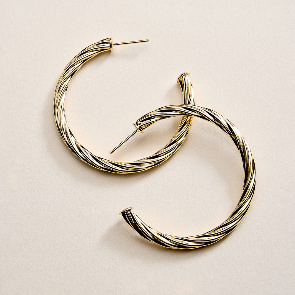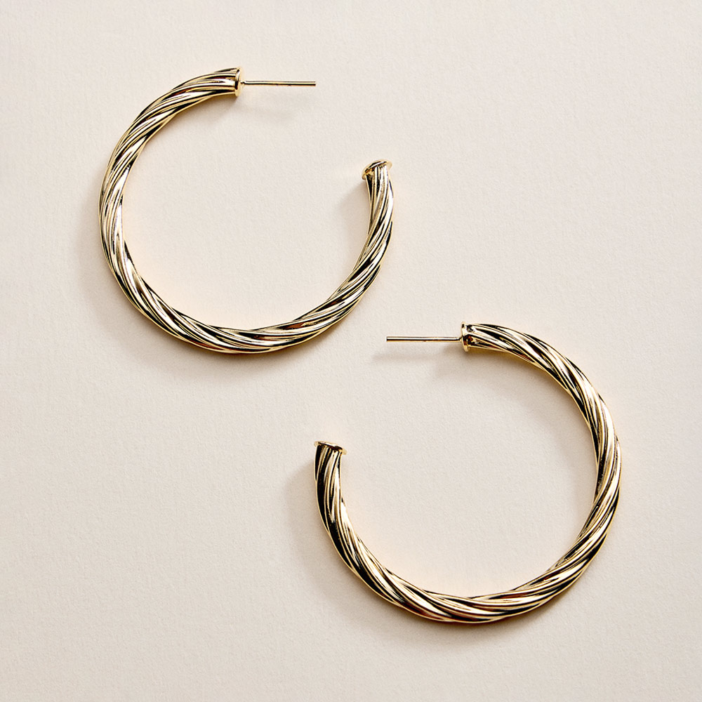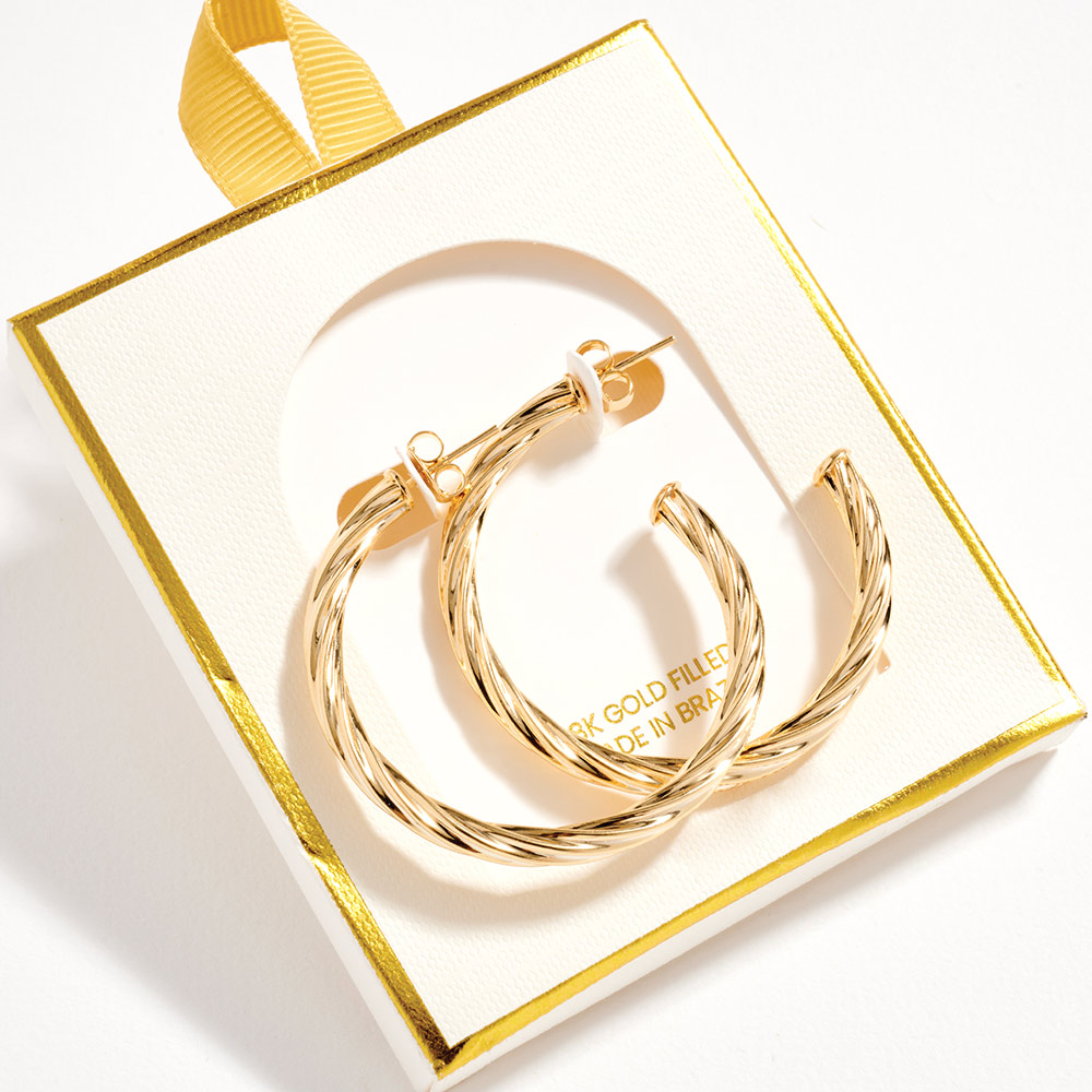 Details • Size : 1.75" X 1.75" X 0.2" • Post Back • Classic hoop earrings with a twisted silhouette that adds subtle texture and dimension. Designed for comfortable daily wear, these hoops offer a timeless look that pairs easily with casual outfits, office styling, or layered jewelry for a polished, versatile finish. • Gold Filled • Hypoallergenic • Lead and Nickel Compliant • Made In Brazil