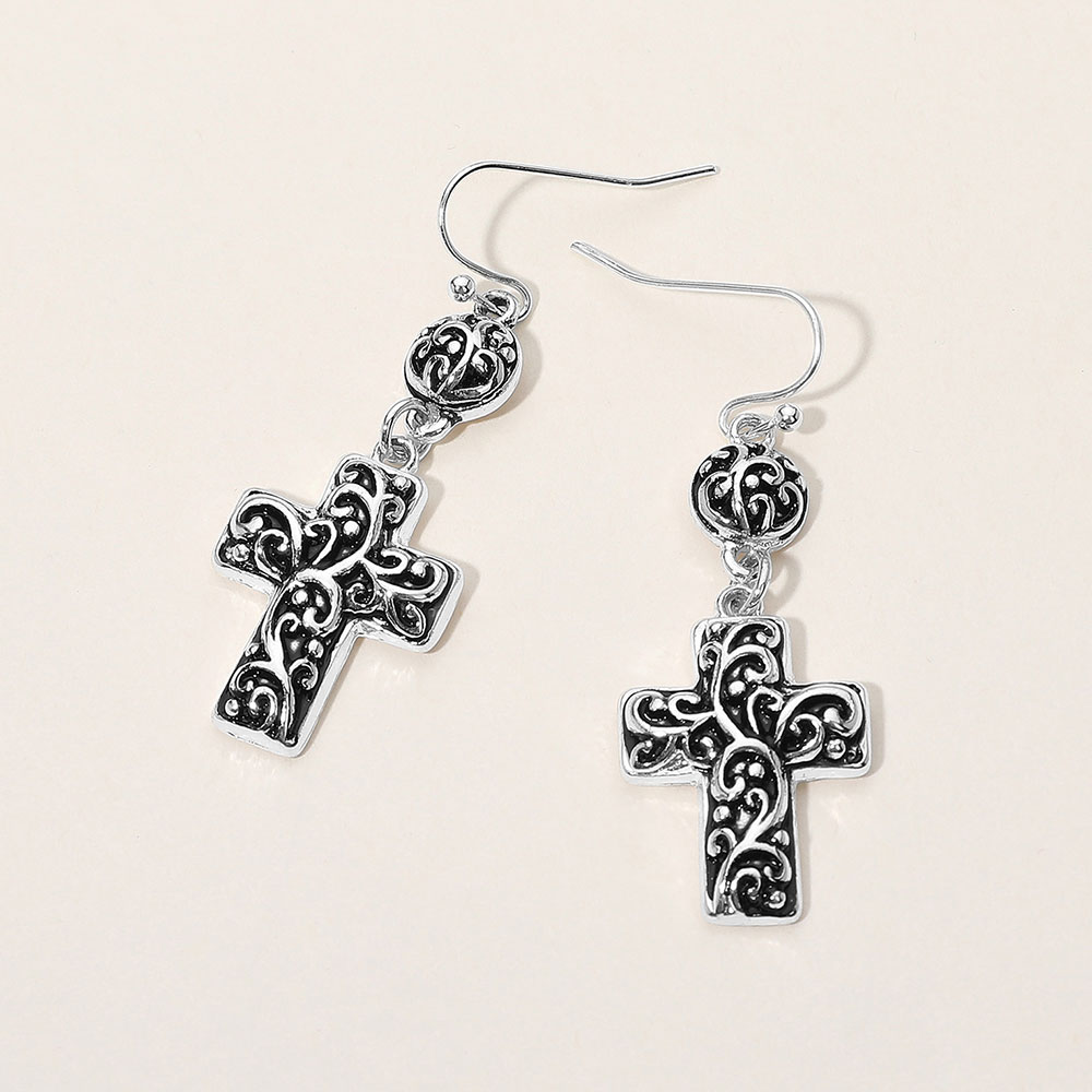 Details • Size : 0.8" X 1.8" • Fish Hook Back • Stylish dangle earrings featuring ornate cross designs with intricate filigree detailing. A meaningful accessory that combines elegance with symbolic charm, perfect for everyday or special occasions. • Lead and Nickel Compliant