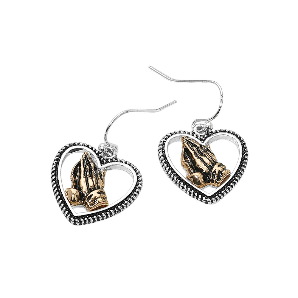 Details • Size : 0.75" X 1.25" • Fish Hook Back • Showcase your faith with these Praying Hands Heart earrings. Featuring detailed praying hands centered within a heart design, these earrings symbolize hope, devotion, and spiritual strength. A meaningful piece of jewelry and a thoughtful gift for loved ones. • Lead and Nickel Compliant
