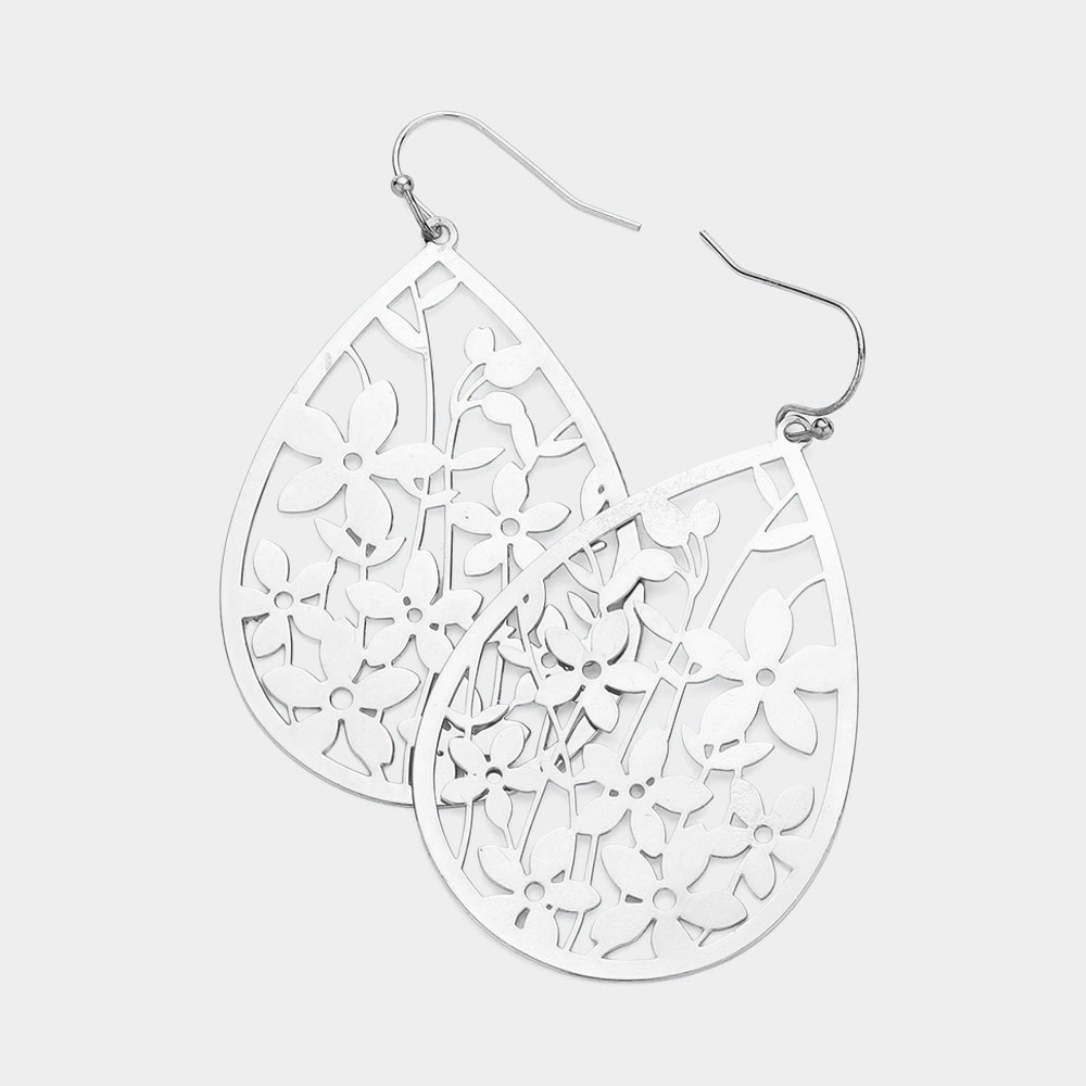 Brass Metal Flower Filigree Teardrop Dangle Earrings