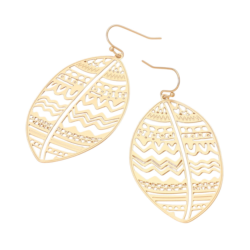 Brass Metal Tribal Pattern Cutout leaf Dangle Earrings