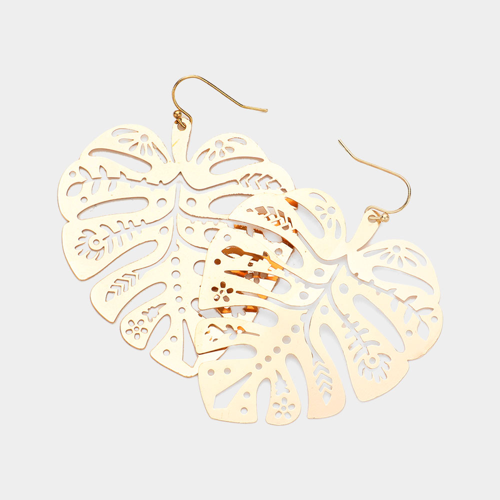 Details • Size : 2" X 2.7" • Fish Hook Back • Add a touch of nature-inspired elegance with these tropical leaf cutout earrings. Featuring an intricate openwork design, they bring a refreshing, breezy feel to your look. Perfect for vacations, casual days, or summer outfits, these earrings combine charm and sophistication effortlessly. • Lead and Nickel Compliant • Brass