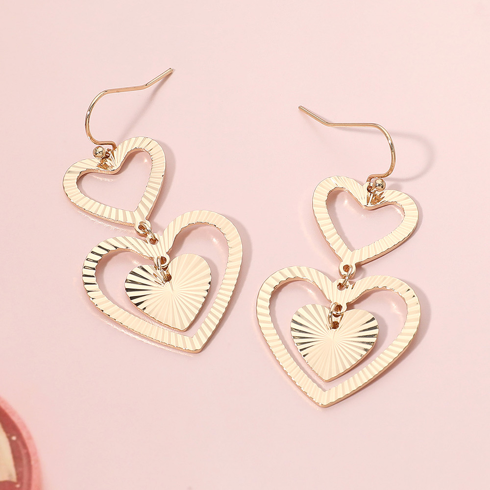 Details • Size : 1" X 2" • Fish Hook Back • Chic double heart dangle earrings featuring layered cutout designs with a textured finish. Lightweight and stylish, these earrings add a romantic and playful charm, perfect for casual or dressy looks. • Lead and Nickel Compliant