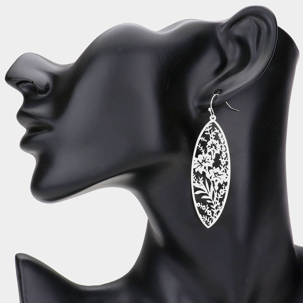 Filigree Flower Leaf Detailed Brass Metal Marquise Dangle Earrings