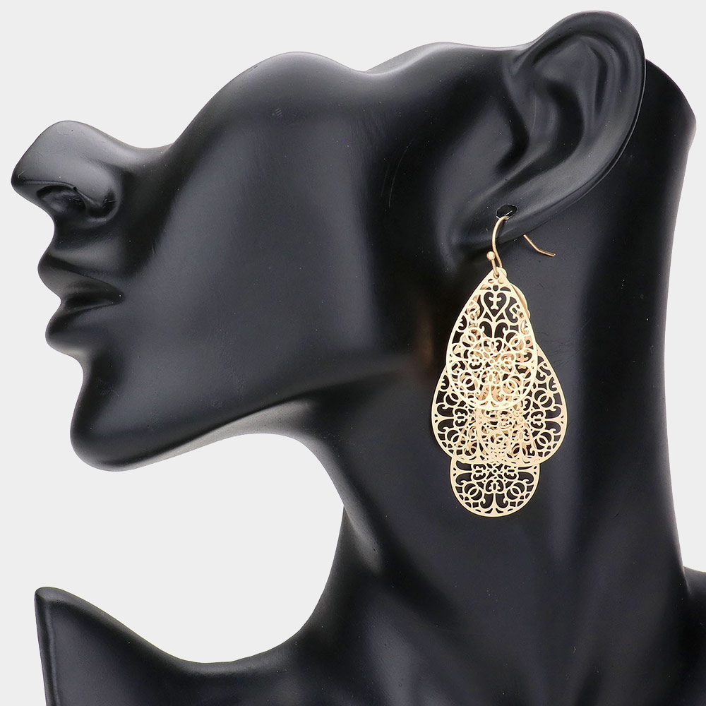 Metal Leaf Filigree Teardrop Dangle Earrings