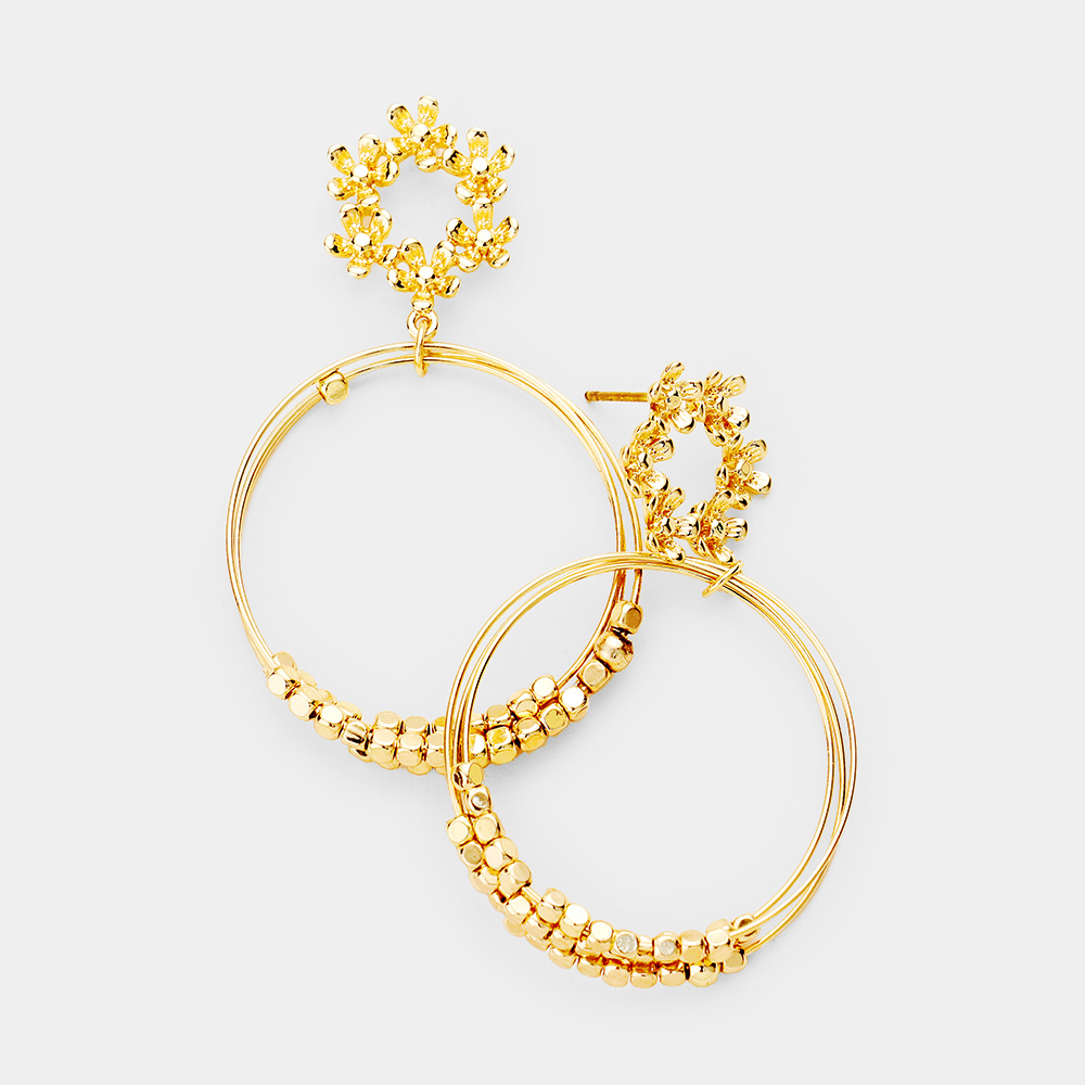 Faceted Beads Flower Embellished Circle Metal Wire Dangle Earrings