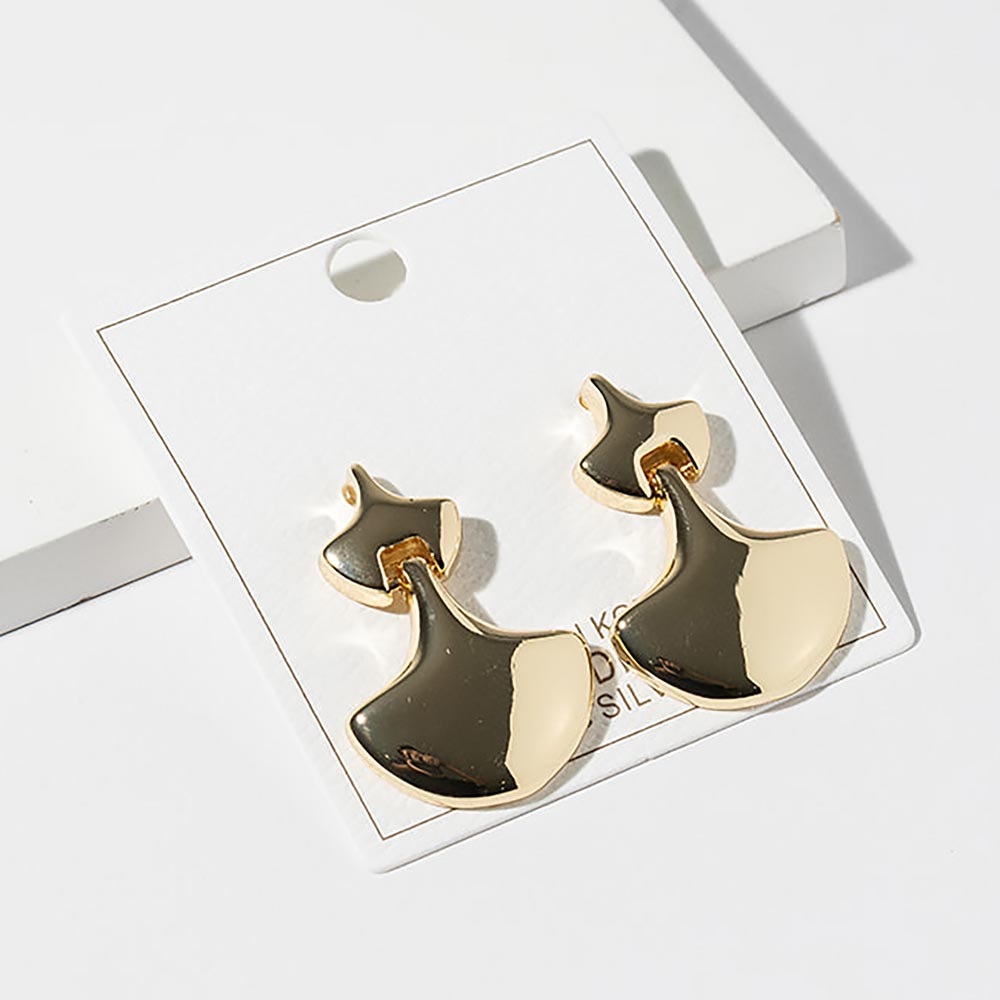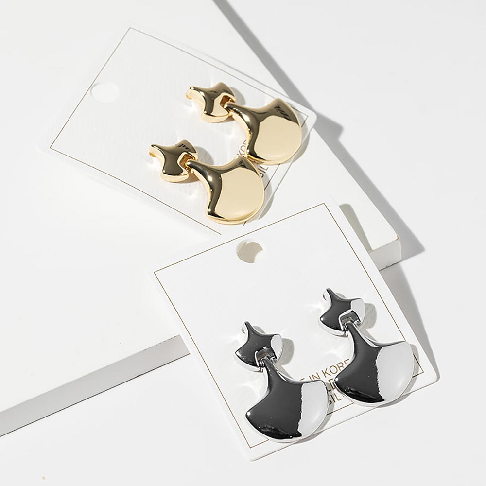 Details • Size : 0.9" X 1.4" • Modern abstract fan shape drop stud earrings featuring a smooth sculptural silhouette with a subtle dangle design. A stylish choice for everyday wear or elevated looks, ideal for boutiques seeking contemporary, minimalist jewelry with versatile appeal and trend-forward elegance. • Gold Dipped • Lead and Nickel Compliant • Made In Korea • Sterling Silver Post