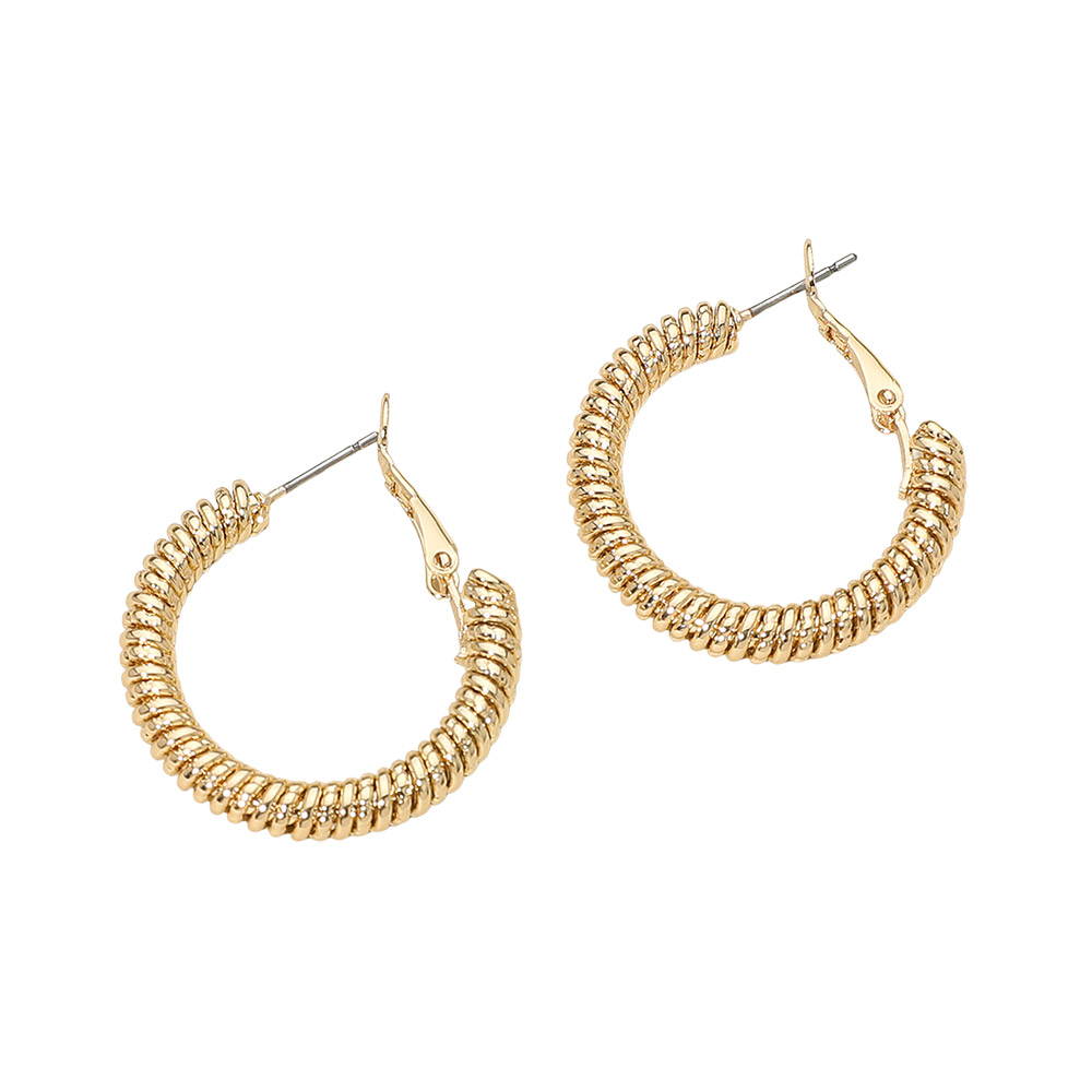 • Stylish coil-texture hoop earrings featuring a bold wrapped design that adds eye-catching dimension to any outfit. Lightweight, comfortable, and perfect for both casual and dressy looks, with secure latch-back closure for easy everyday wear.