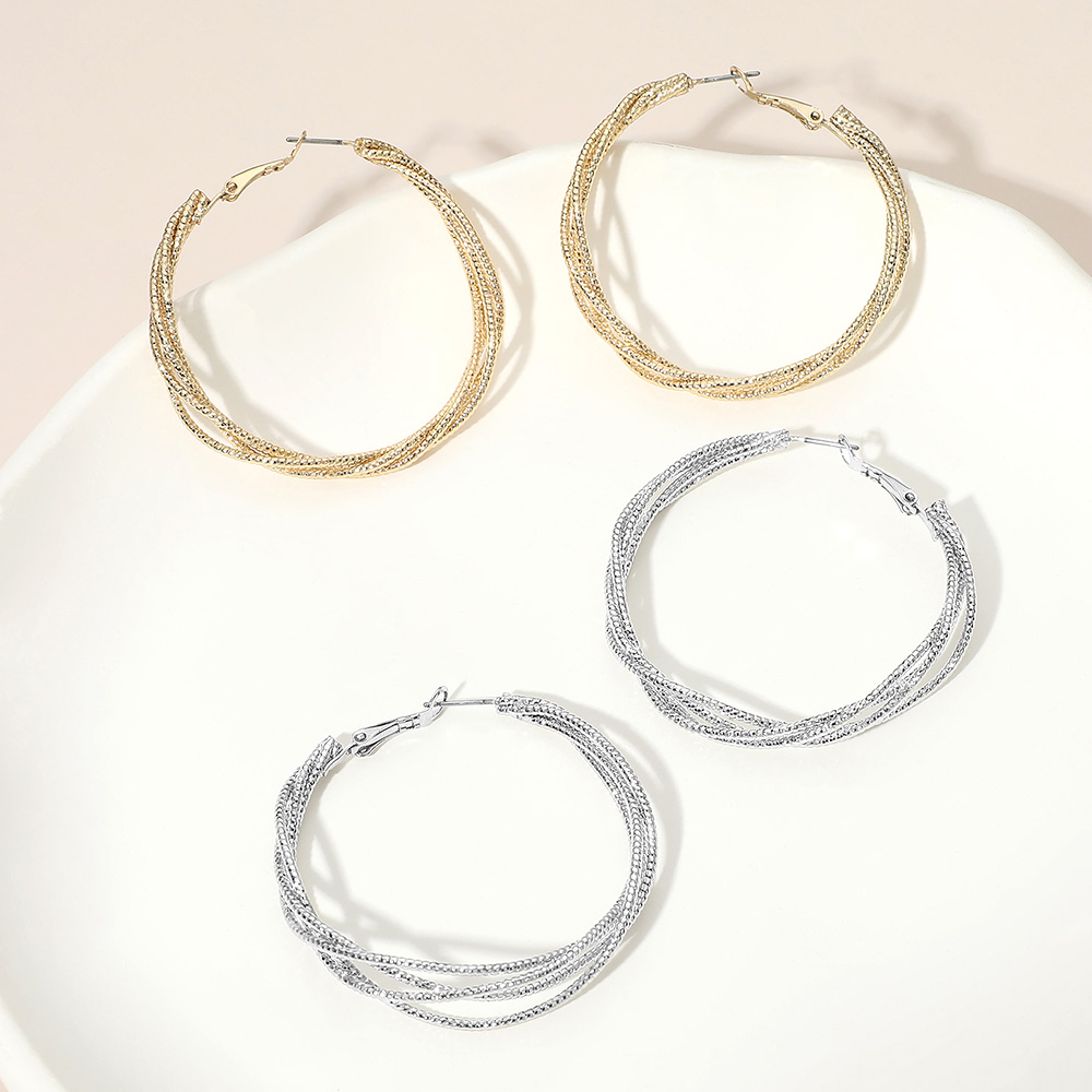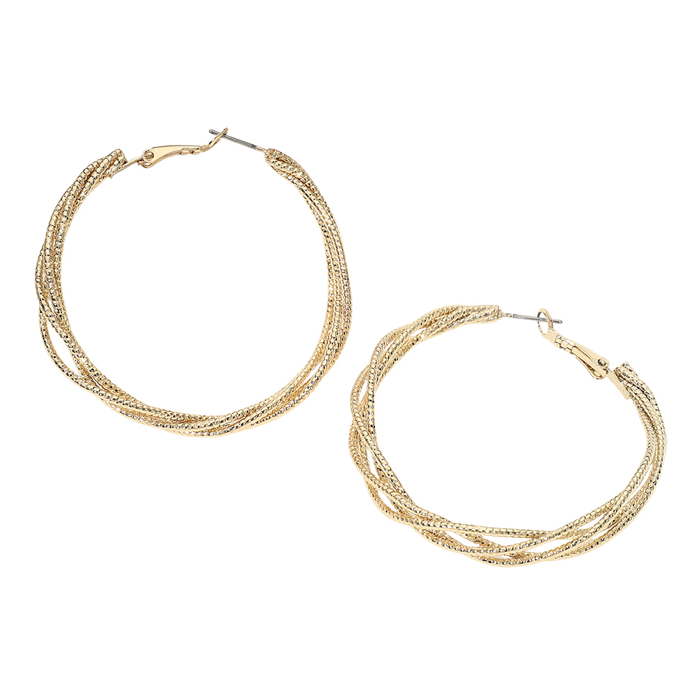 Details • Size : 2" X 2" • Omega Back • Elegant layered hoop earrings designed with multiple intertwined strands that create depth and visual interest. A refined yet versatile accessory ideal for daily wear or special occasions, offering a polished statement that pairs effortlessly with casual outfits, work looks, and evening ensembles. Perfect for boutique jewelry assortments and gifting displays. • Lead and Nickel Compliant • Gold Dipped