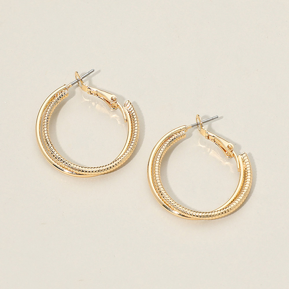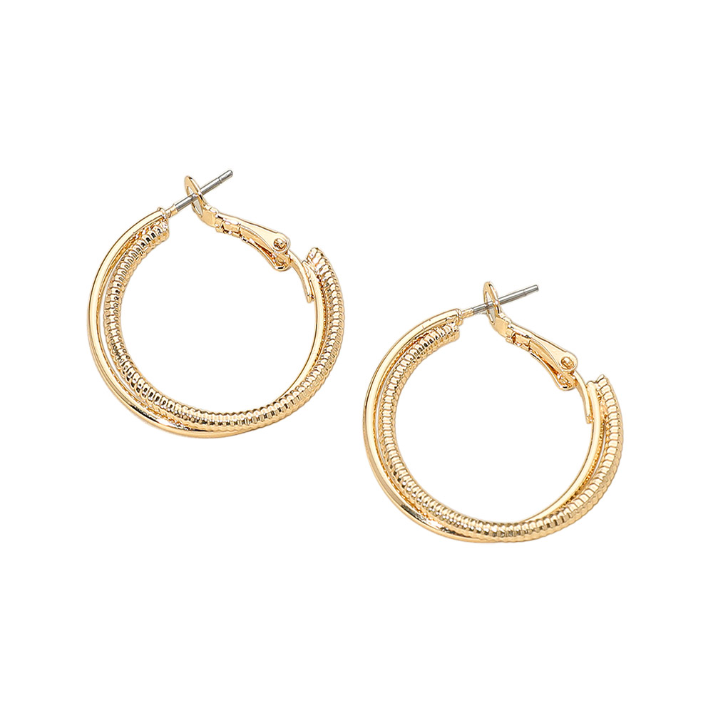 Details • Size : 2" X 2" • Omega Back • Small textured hoop earrings featuring a detailed beaded-edge design and smooth rounded profile. Lightweight and comfortable with secure latch-back closures, perfect for everyday wear or adding a polished touch to any occasion. • Lead and Nickel Compliant • Gold Dipped