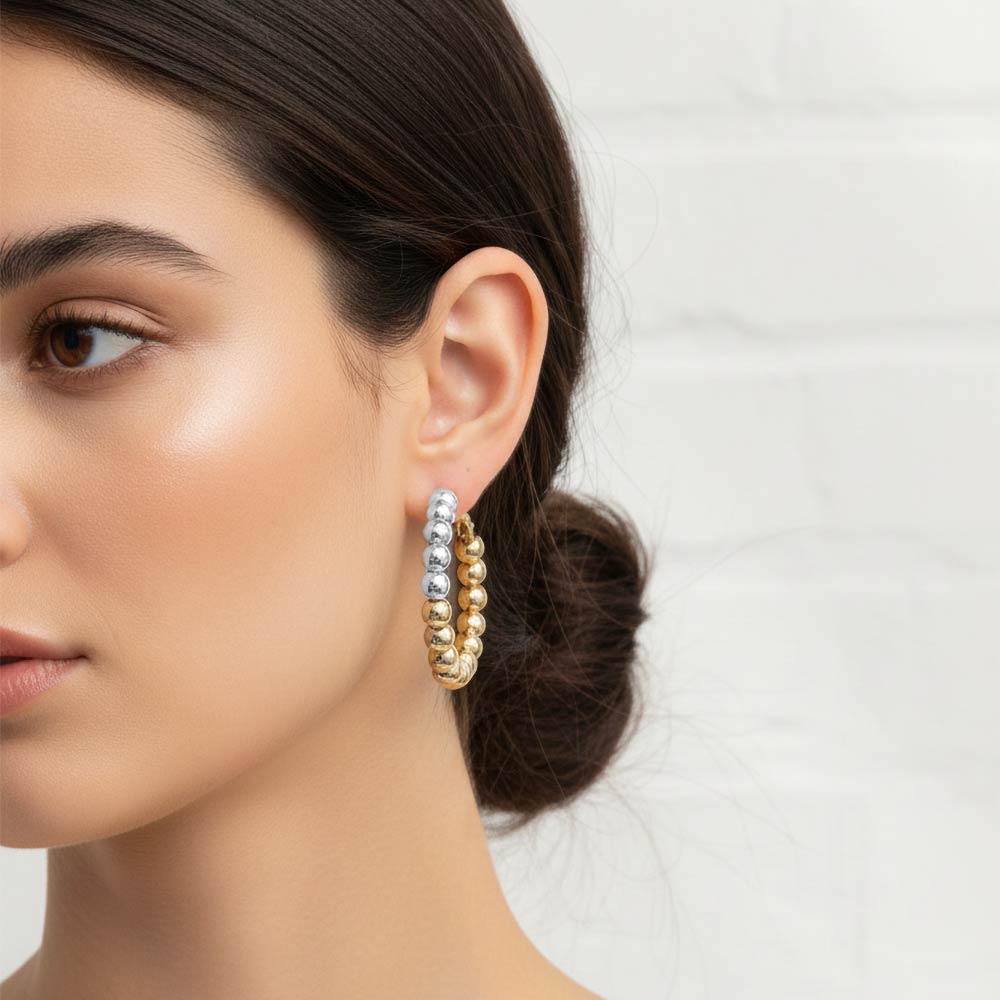 Details • Size : 1.4" X 1.4" • Omega Back • Stylish twisted hoop earrings designed with layered beaded detailing for a modern statement look. Lightweight yet eye-catching, these drop hoops add movement and texture to everyday outfits, workwear, or evening styles. A versatile accessory choice for trend-driven collections and boutique assortments. • Gold Dipped • Lead and Nickel Compliant • Made In Korea • Sterling Silver Post