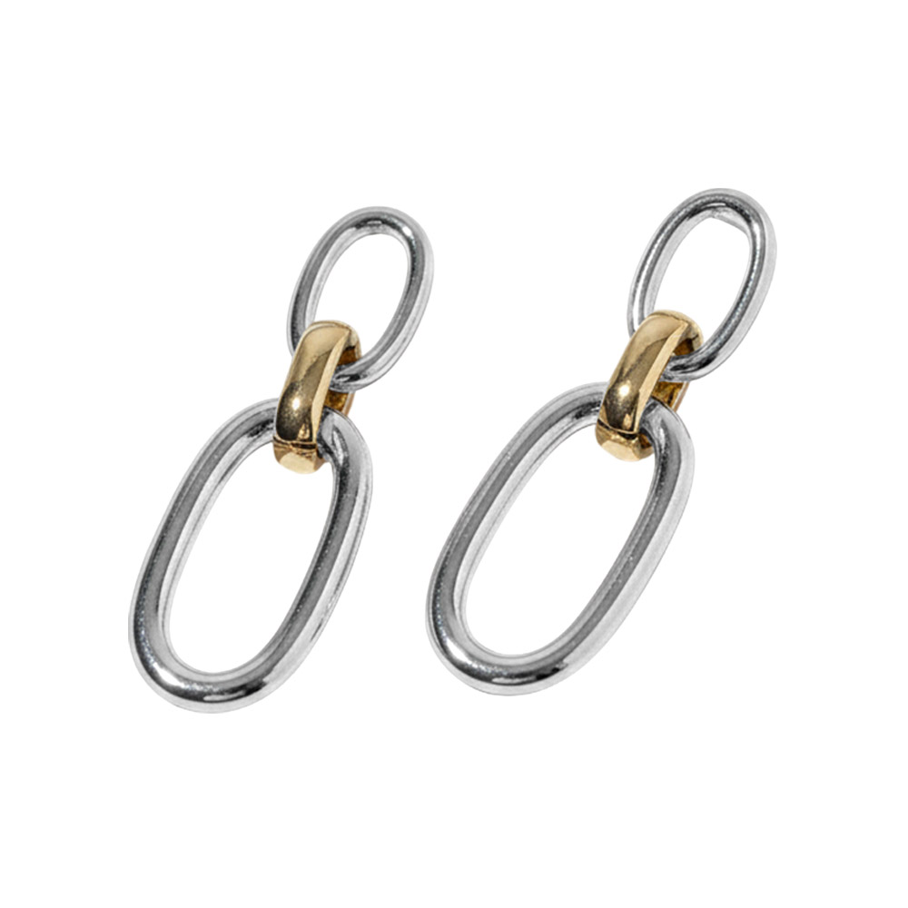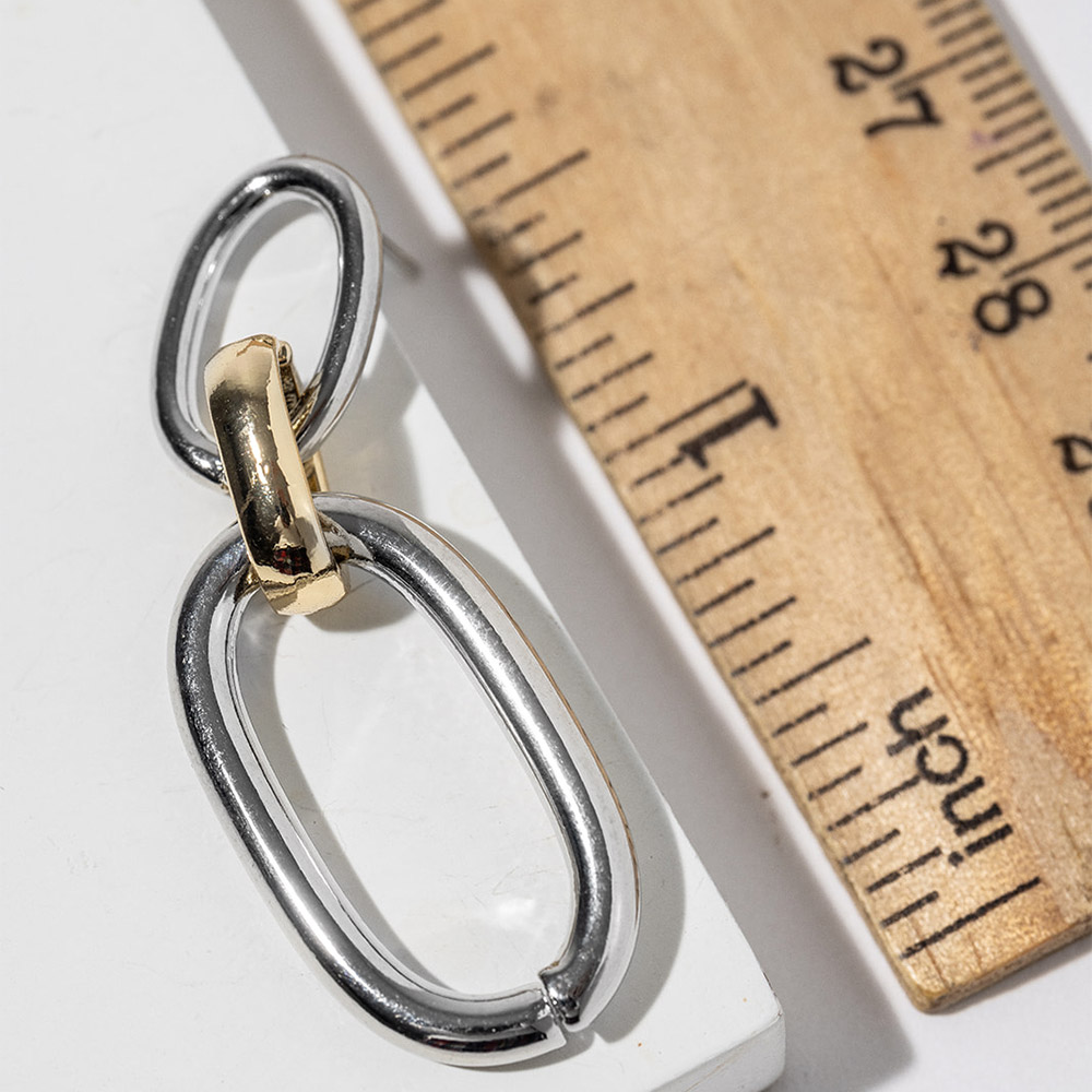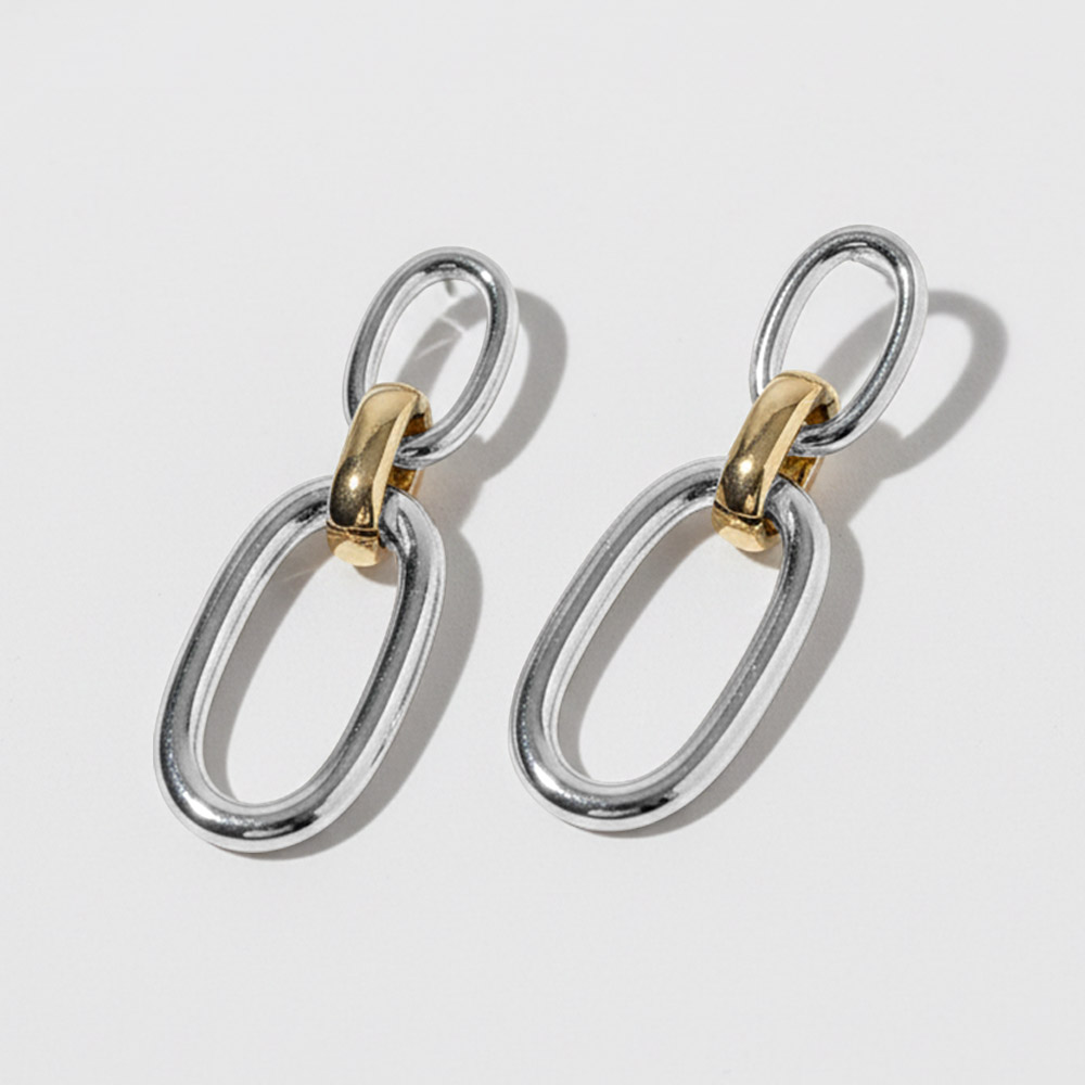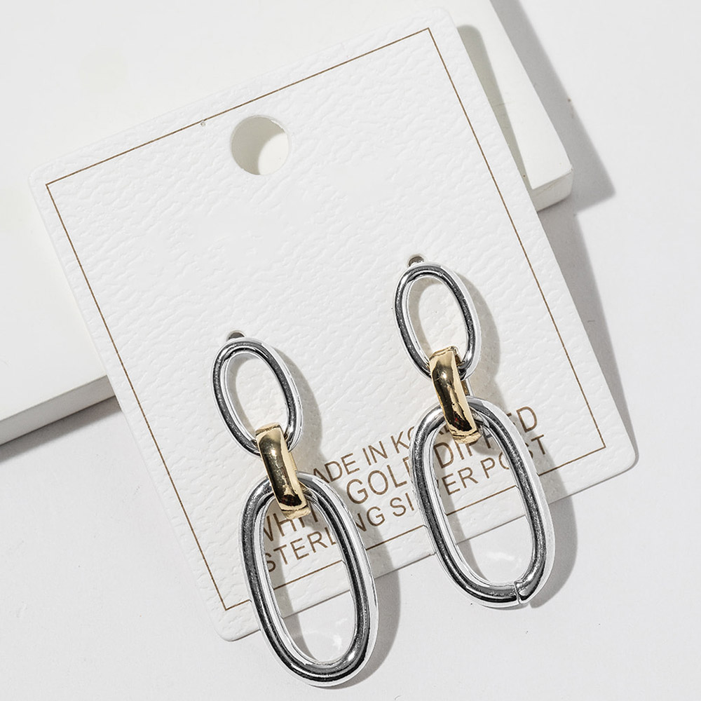 Details • Size : 0.6" X 1.7" • These modern drop earrings feature a sleek double link silhouette that creates effortless movement and a refined, contemporary look. Designed for everyday styling, they pair easily with casual outfits or elevated ensembles, making them ideal for boutique collections, gifting displays, and trend-focused jewelry assortments. • Gold Dipped • Lead and Nickel Compliant • Made In Korea • Sterling Silver Post