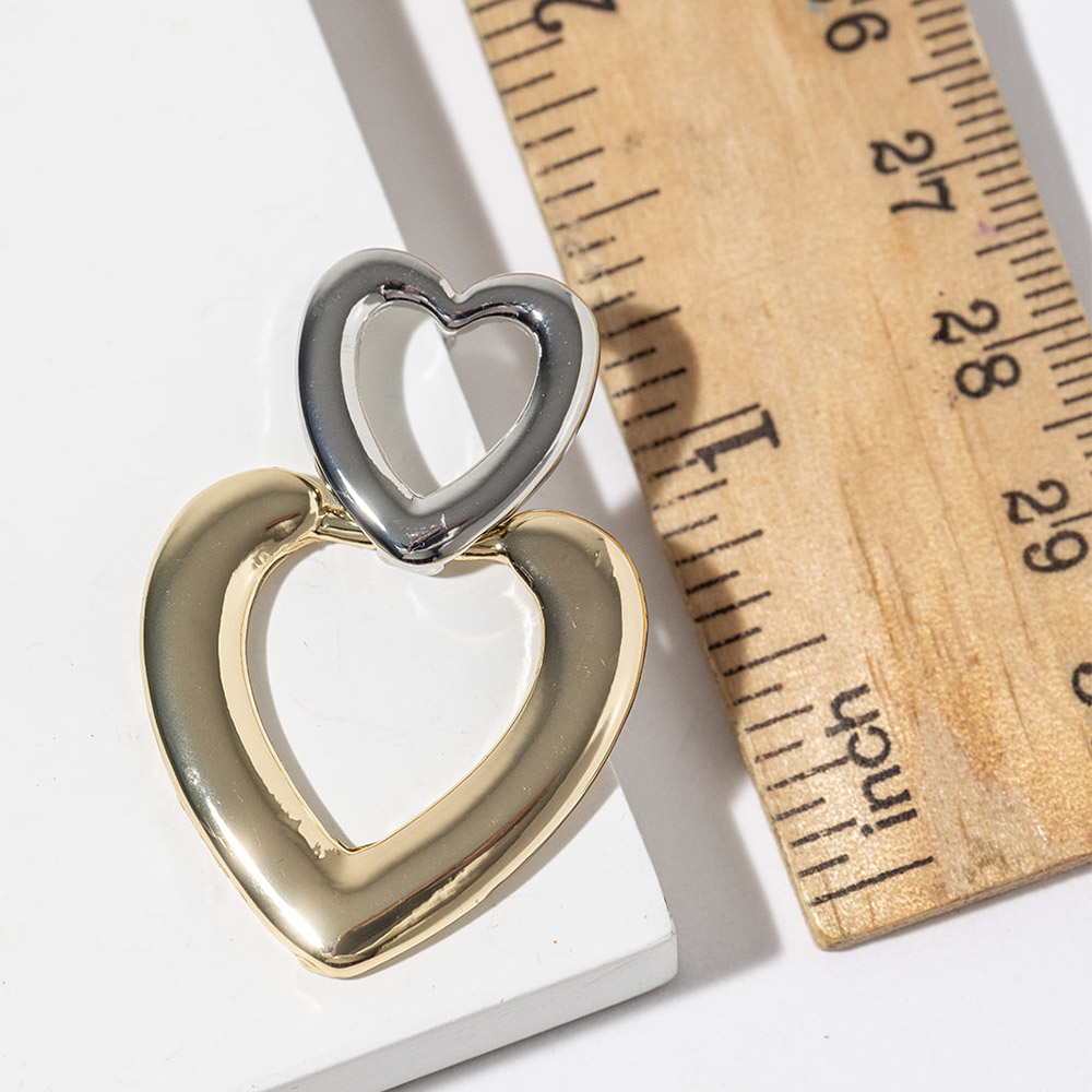 Details • Size : 1" X 1.5" • Double heart drop earrings featuring a layered open-heart silhouette that creates a modern yet romantic look. Designed to add movement and visual interest, this versatile style is perfect for everyday wear, giftable collections, and seasonal edits, pairing effortlessly with both casual and elevated outfits. • Gold Dipped • Lead and Nickel Compliant • Made In Korea • Sterling Silver Post