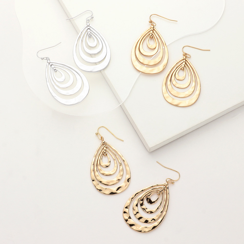 Hammered Metal Concentric Teardrop Dangle Earrings