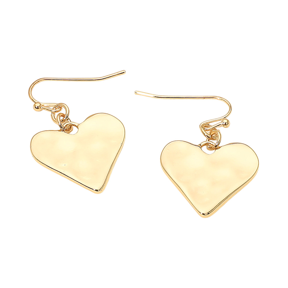 Details • Size : 0.8" X 1.3" • Fish Hook Back • These hammered heart dangle earrings showcase a smooth, reflective finish with a subtly textured surface for a handcrafted charm. Lightweight and romantic, they add a touch of playful elegance to any look, perfect for expressing love and style in both casual and dressy moments. • Lead and Nickel Compliant