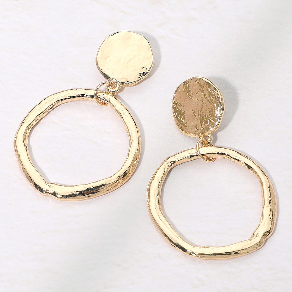 Details • Size : 1.6" X 2.5" • Post Back • Hammered circle drop earrings feature a textured round stud paired with an open hoop silhouette for modern movement and eye-catching style. Designed to complement casual outfits or elevated looks, they deliver bold impact with versatile appeal for everyday wear or special occasions. • Lead and Nickel Compliant