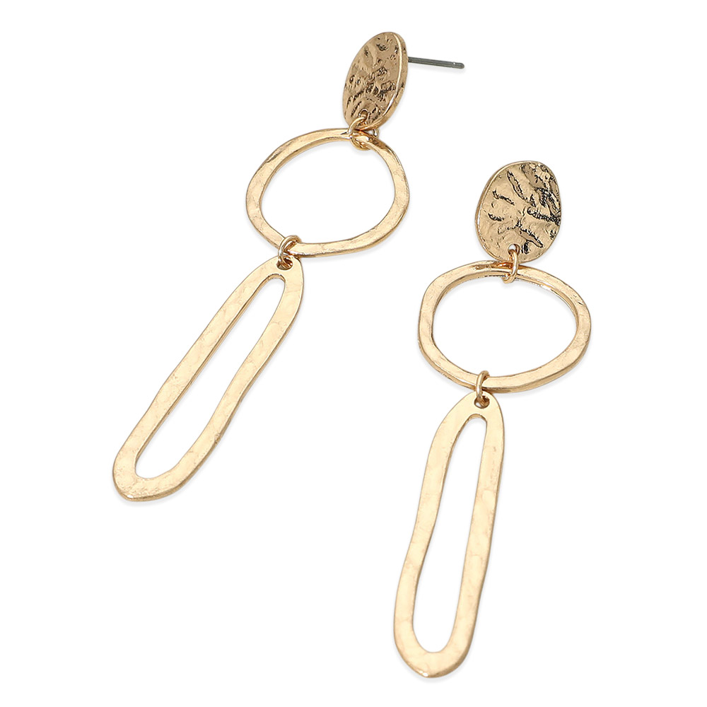 Details • Size : 0.8" X 2.75" • Post Back • Contemporary drop earrings featuring layered linked shapes with subtle textured detailing for an artful, modern look. Designed to create fluid movement and visual interest, these statement earrings elevate casual outfits and polished ensembles, making them a versatile choice for trend-forward styling and curated accessory collections. • Lead and Nickel Compliant