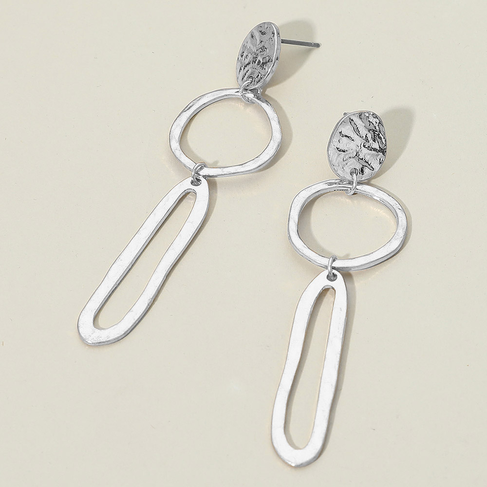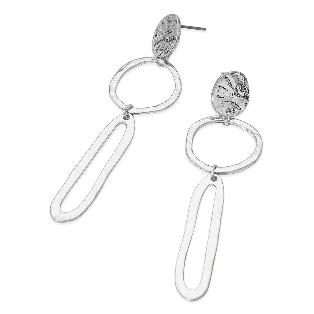 • Contemporary drop earrings featuring layered linked shapes with subtle textured detailing for an artful, modern look. Designed to create fluid movement and visual interest, these statement earrings elevate casual outfits and polished ensembles, making them a versatile choice for trend-forward styling and curated accessory collections.